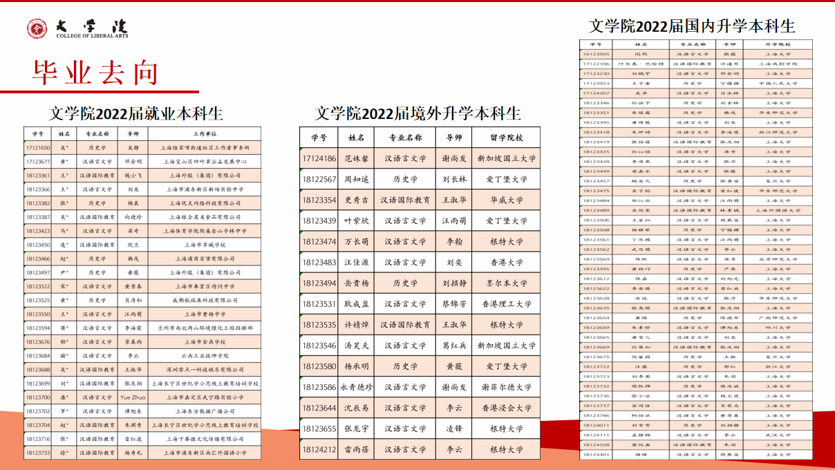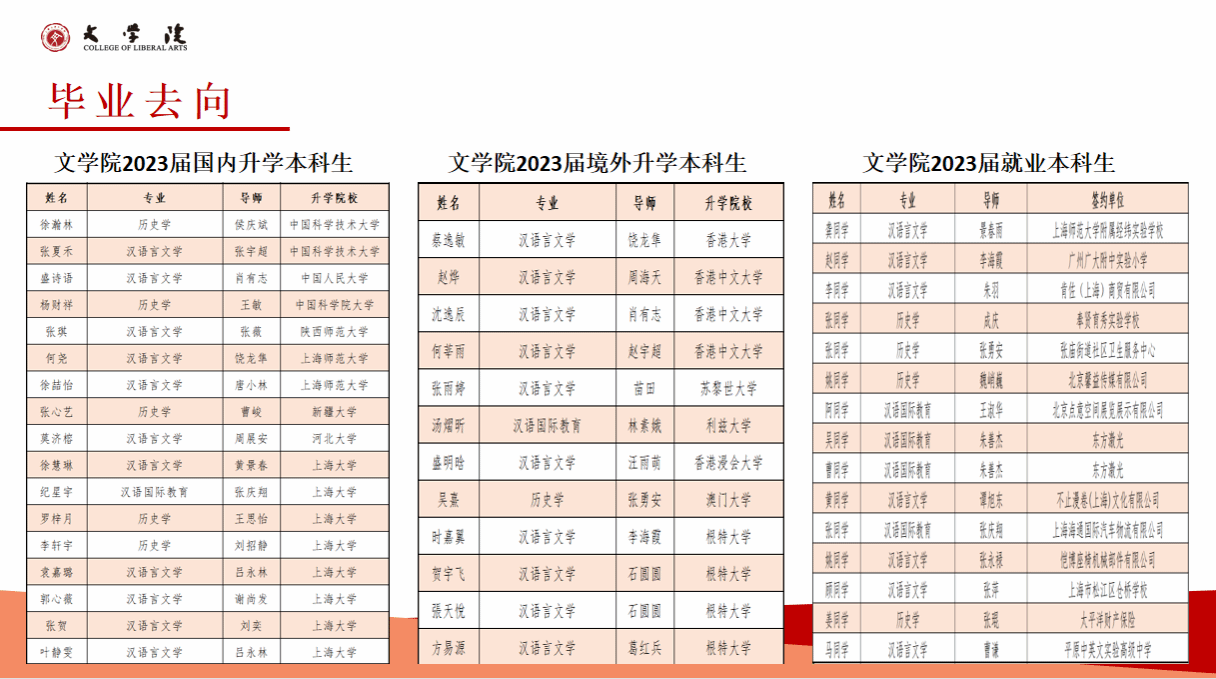 jdb电子中国官方网站2023年的本科毕业生的就业率为89.66%,就业方向主要集中在教育、机关事业、文化艺术、出版编辑等行业和领域,就业行业的分布相对较广,其中部分优秀毕业生入职华为、腾讯、振华重工等全球五百强企业。近年来,超过30%的本科生毕业后选择继续深造,其中2023年继续深造比例达47.4%。多人考取或免试直升复旦大学、中山大学、中国人民大学、武汉大学等国内名牌大学。出国(境)深造比例也在持续提升,2023年出国(境)学生中,50%进入QS全球排名前100的国际一流高校攻读硕士学位,香港大学、香港中文大学、利兹大学、苏黎世大学、诺丁汉大学等。