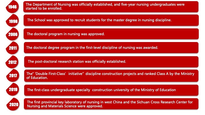 The School, founded in 1915 by a Canadian nurse named Ms. Caroline Wellwood, is committed to establishing the optimal nursing education and scientific research platform in China. With the history of more than 100 years, the nursing discipline, which serves for great national demands and protect human health, have gradually formed.