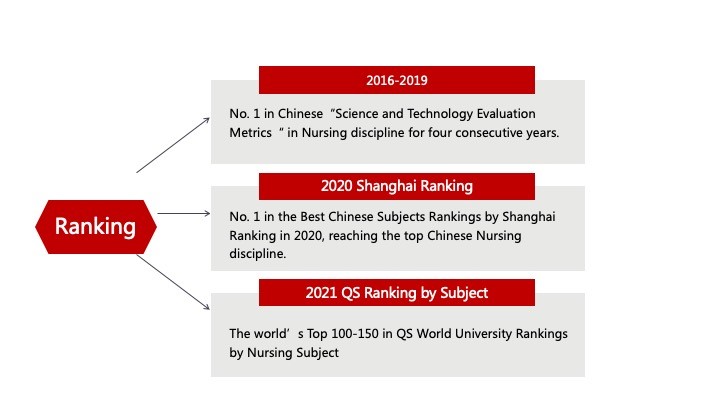 Focusing on discipline construction, the School is always devoted to cultural construction, nursing education, nursing research, international cooperation, supporting platforms and social reputation. Up to now, it has formed a framework for cultivating high-caliber talents with the strong support of 4 hospitals and 15 teaching and research sections; created a discipline construction framework comprising head nurses of department, head nurses of specialties and associate head nurses of specialties; and fostered a new force for the construction of nursing discipline through integration, innovation and inheritance. In the new era, the School is geared to push forward the construction of the nursing discipline with great passion and broad mind.