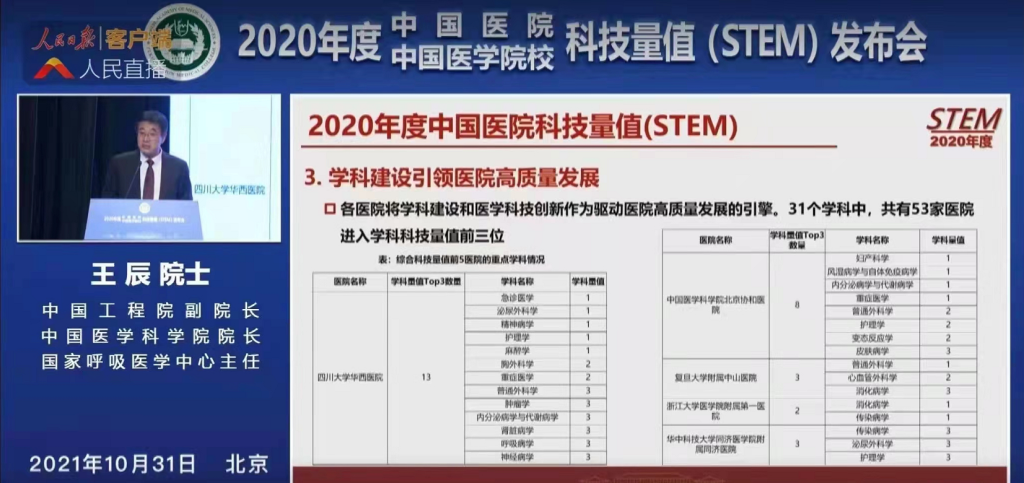 On October 31, 2020, China Hospital Science and Technology Evaluation Metrics (STEM) comprehensive ranking and 31 disciplines rankings were released. West China Hospital, Sichuan University stayed at the top of the overall ranking for consecutive 8 years. 13 disciplines stayed at the top three positions. This is the 5th year that the Nursing discipline of our school consecutively ranked the first nationally.