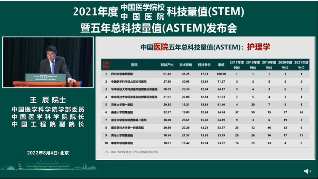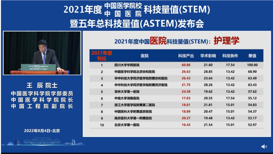 On August 4, 2022, China Medical College/Hospital Science Hospital Science and Technology Evaluation Metrics (STEM) and 5-year Accumulative Science and Technology Evaluation Metrics(ASTEM) ranking were released officially. West China Hospital, Sichuan University stayed at the top of the overall ranking for consecutive 9 years, and 15 disciplines stayed at the top three positions. Nursing discipline of our school ranked the first on 2021 STEM and  the 5-year ASTEM. So far, nursing discipline of our school has stayed at the top of STEM for consecutive 6 years.