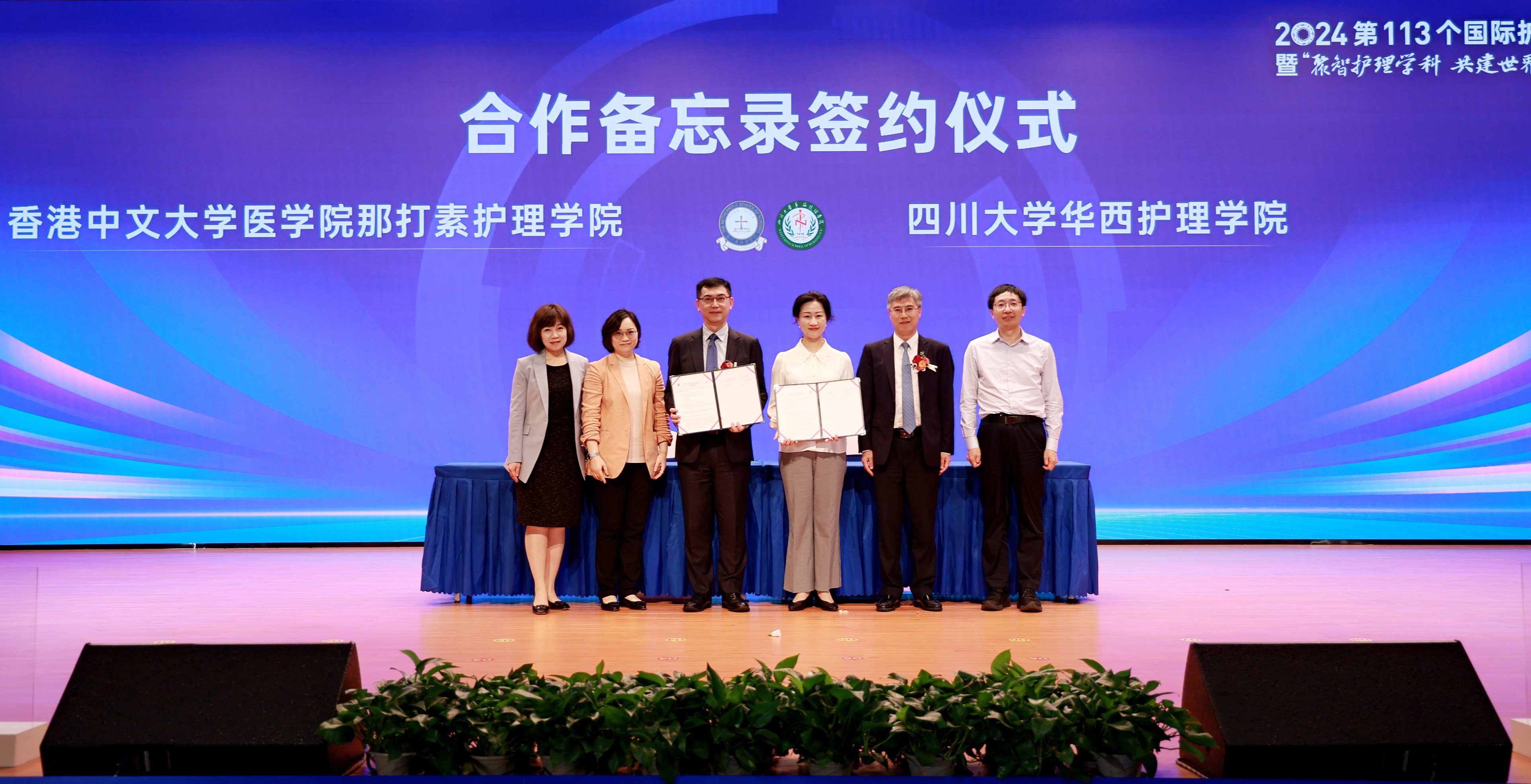 Dean Luo Fengming of West China School of Medicine/West China Hospital of Sichuan University, Deputy Director Yuan Wen of International Office / HK,MC and TW Office of Sichuan University, Executive Vice President Li Zhongming,the Graduate School, and Associate Professor Chow Ka Ming from The Nethersole School of Nursing of Faculty of Medicine of The Chinese University of Hong Kong witnessed the signing ceremony.