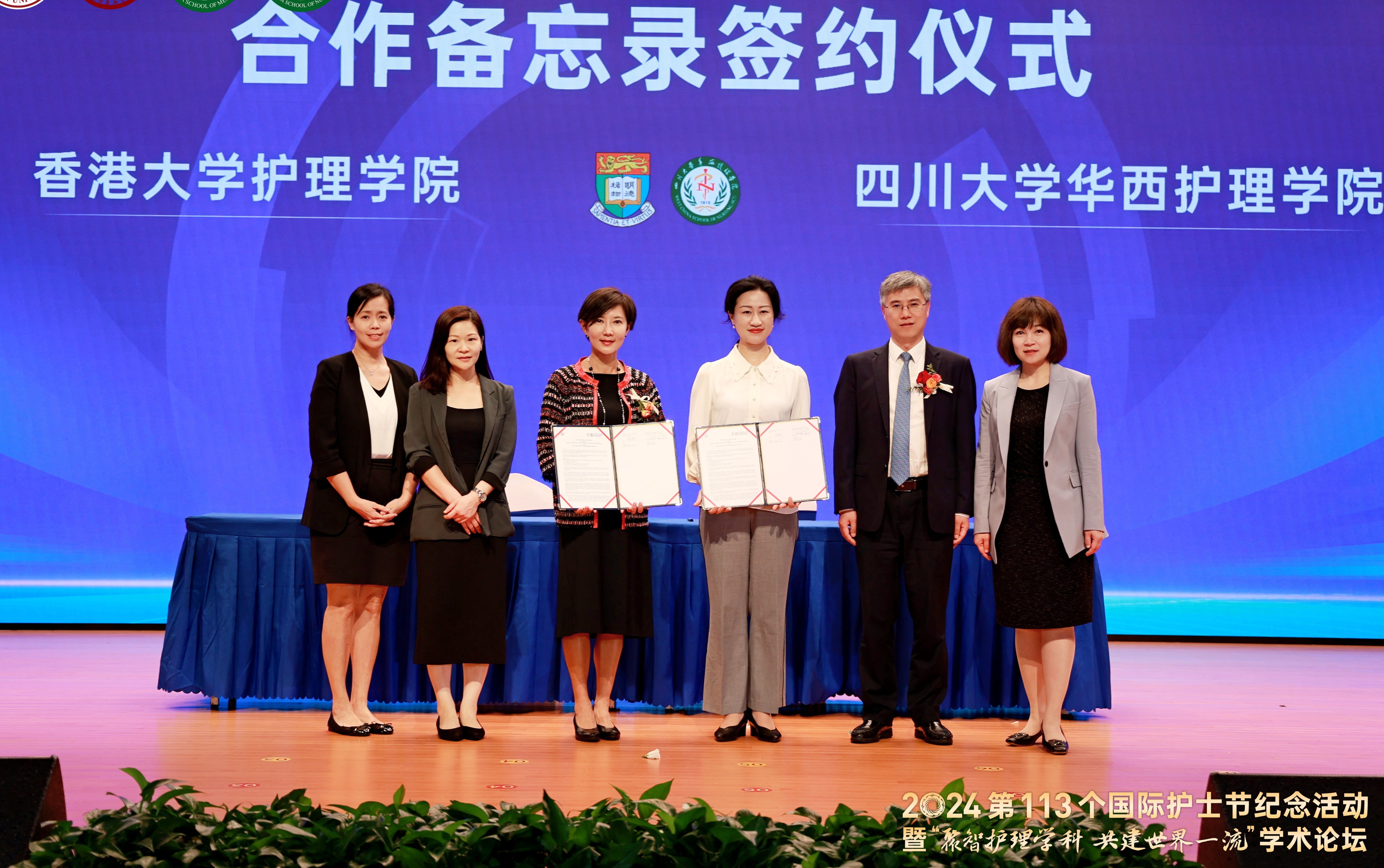 Dean Luo Fengming of West China School of Medicine/West China Hospital of Sichuan University, Deputy Director Yuan Wen of International Office / HK,MC and TW Office of Sichuan University, Professor Doris Sau Fung Yu and Senior Lecturer Polly Siu Ling Chan from School of Nursing of LKS Faculty of Medicine of The University of Hong Kong witnessed the signing ceremony.