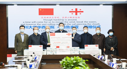The donation ceremony was held in the State-owned Assets Commission of Sichuan Province. Director Xu Jin and Vice Director Shen Ruyuan of the State-owned Assets Commission of Sichuan Province, Vice President Yan Shijing of Sichuan University, President Li Weimin of West China Hospital, Director Yuan Hongling of the Europe-Asia Section of Foreign Affairs Office of Sichuan Province, Vice Chair Yu Hua of Chinese Enterprise Chamber of Commerce in Georgia joined the event.
