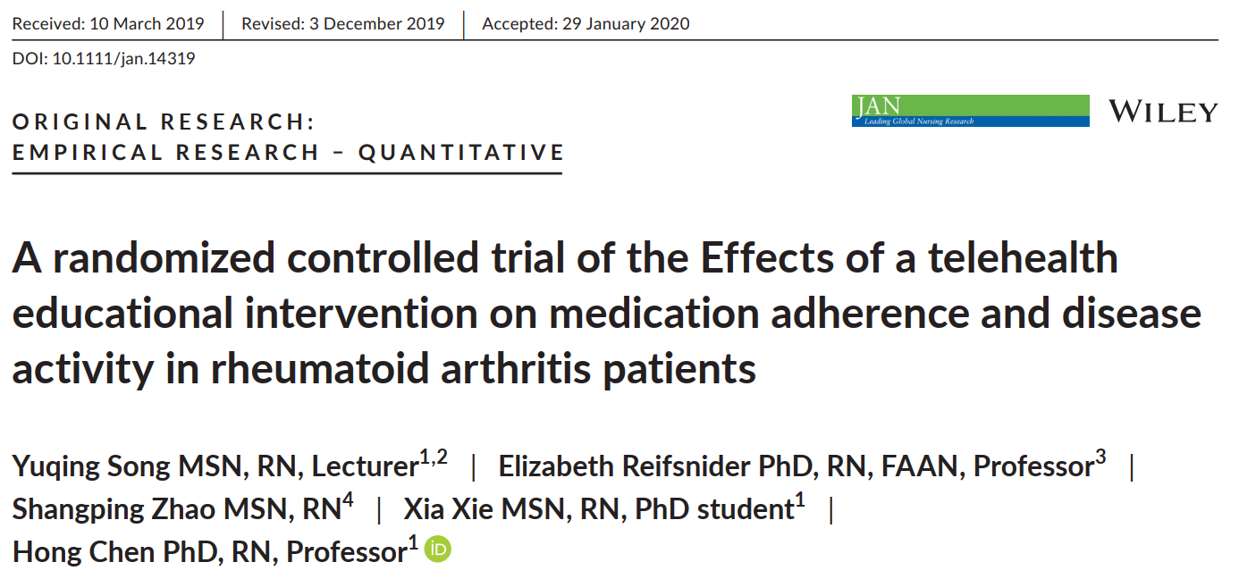 文章标题《远程健康教育干预对类风湿关节炎患者用药依从性和疾病活动影响的随机对照试验》《A randomized controlled trial of the Effects of a telehealth educational intervention on medication adherence and disease activ...