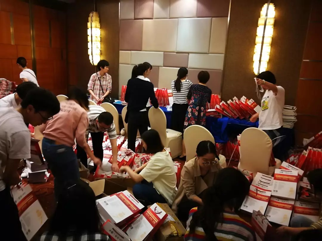 9月18日,工作人员和志愿者们井然有序地整理会议资料袋