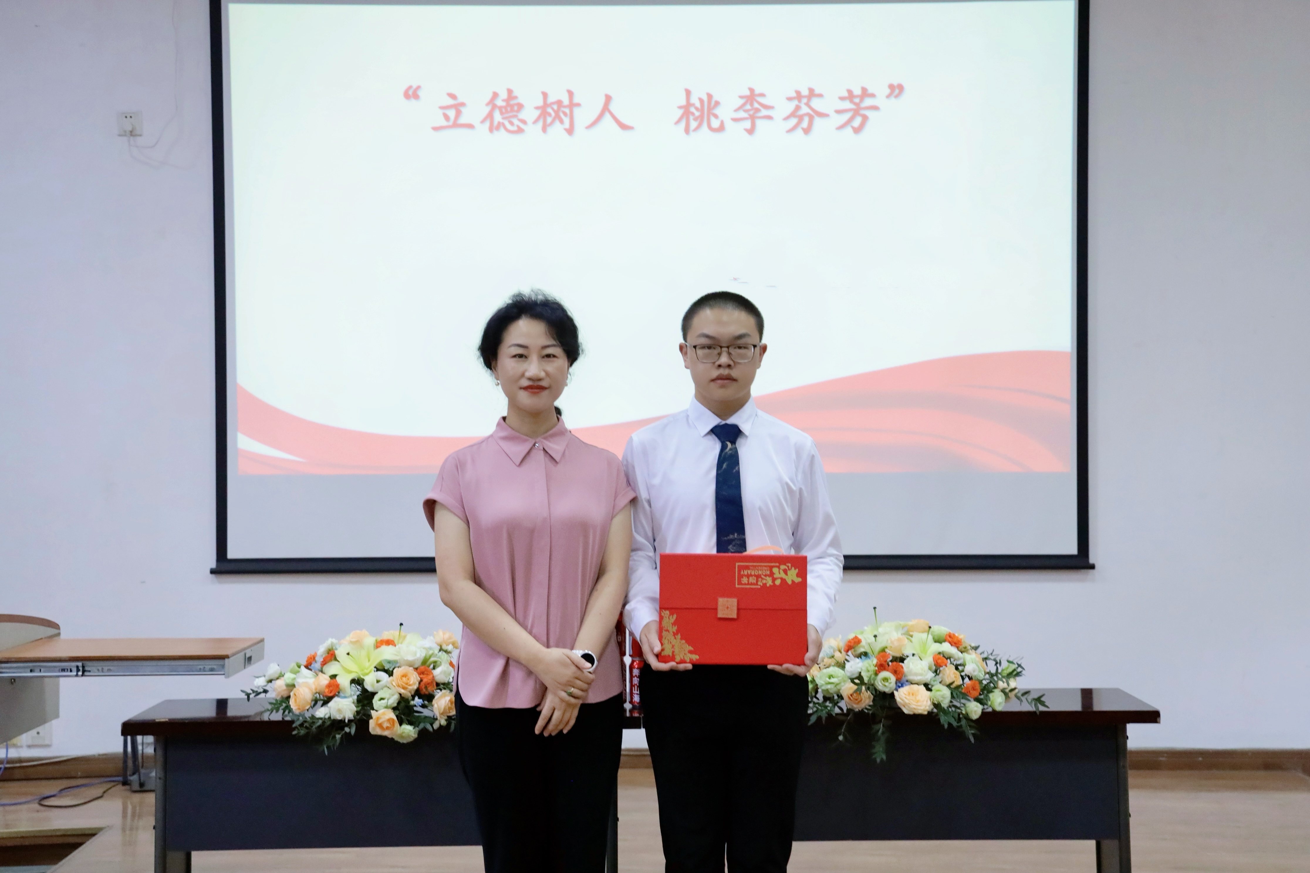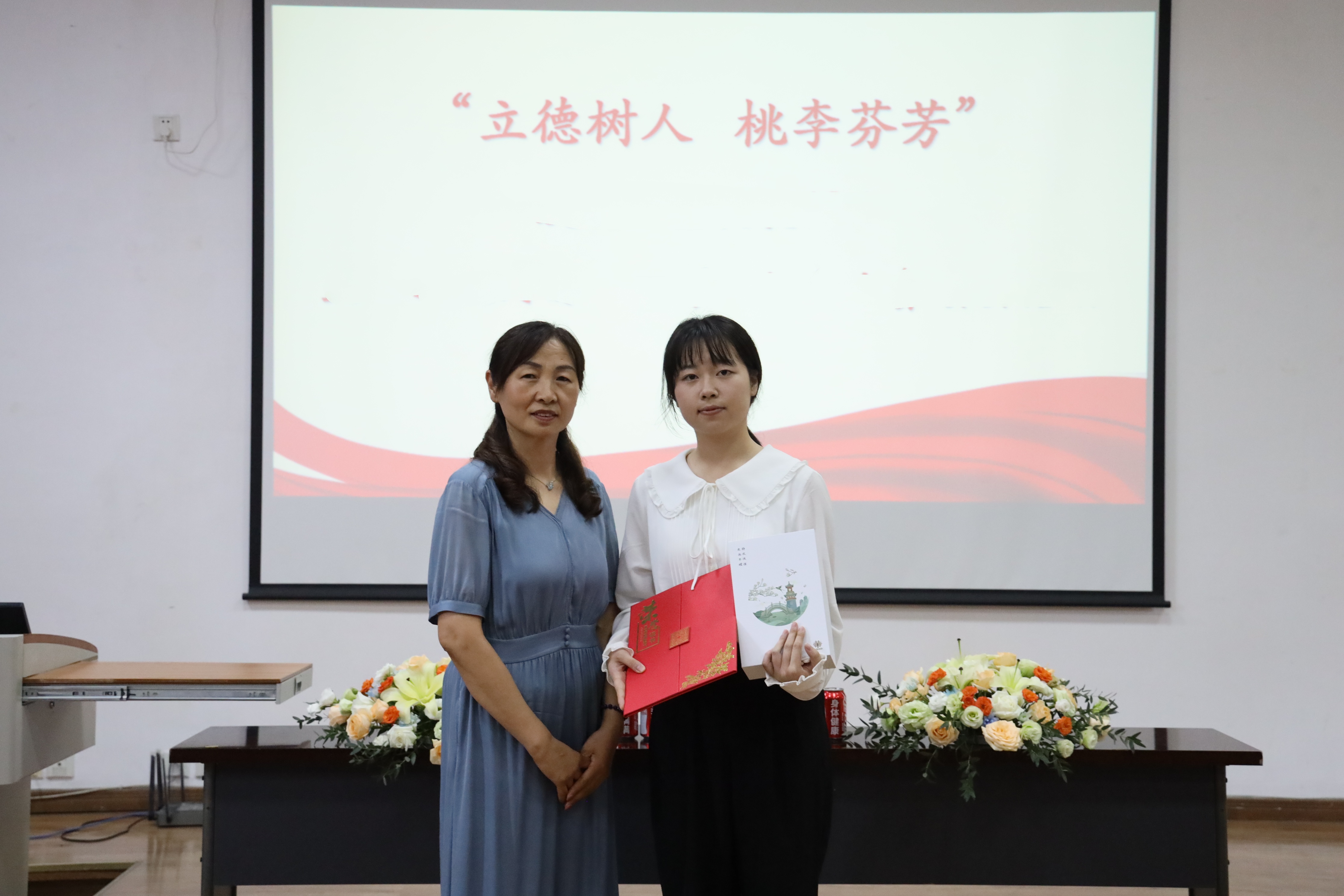 学生代表为李晓玲老师献上鲜花以谢师恩。