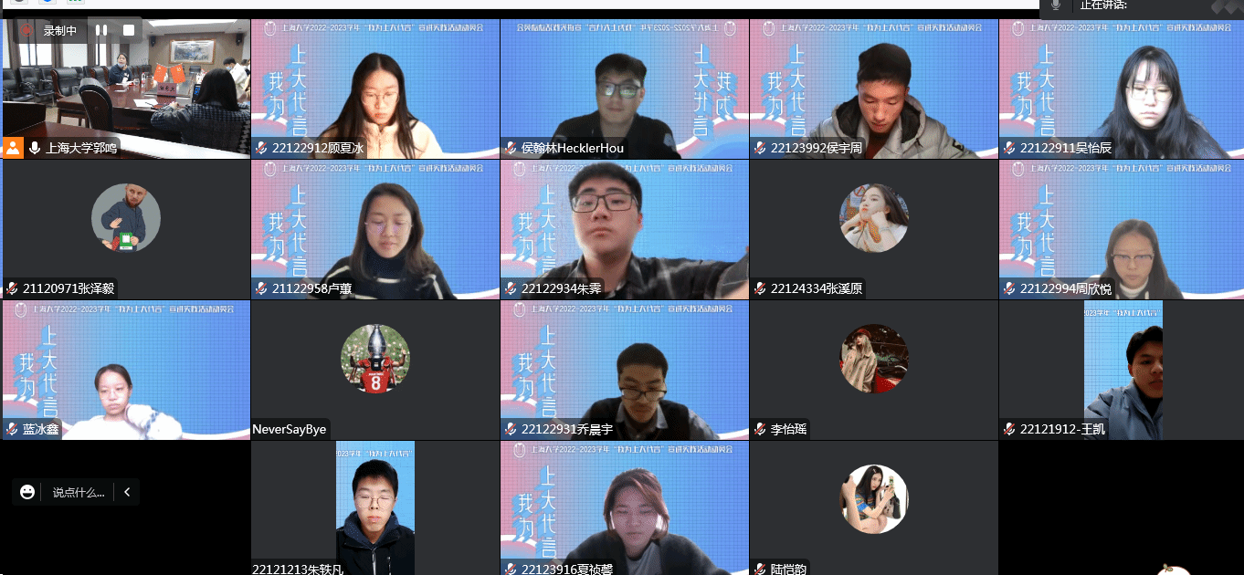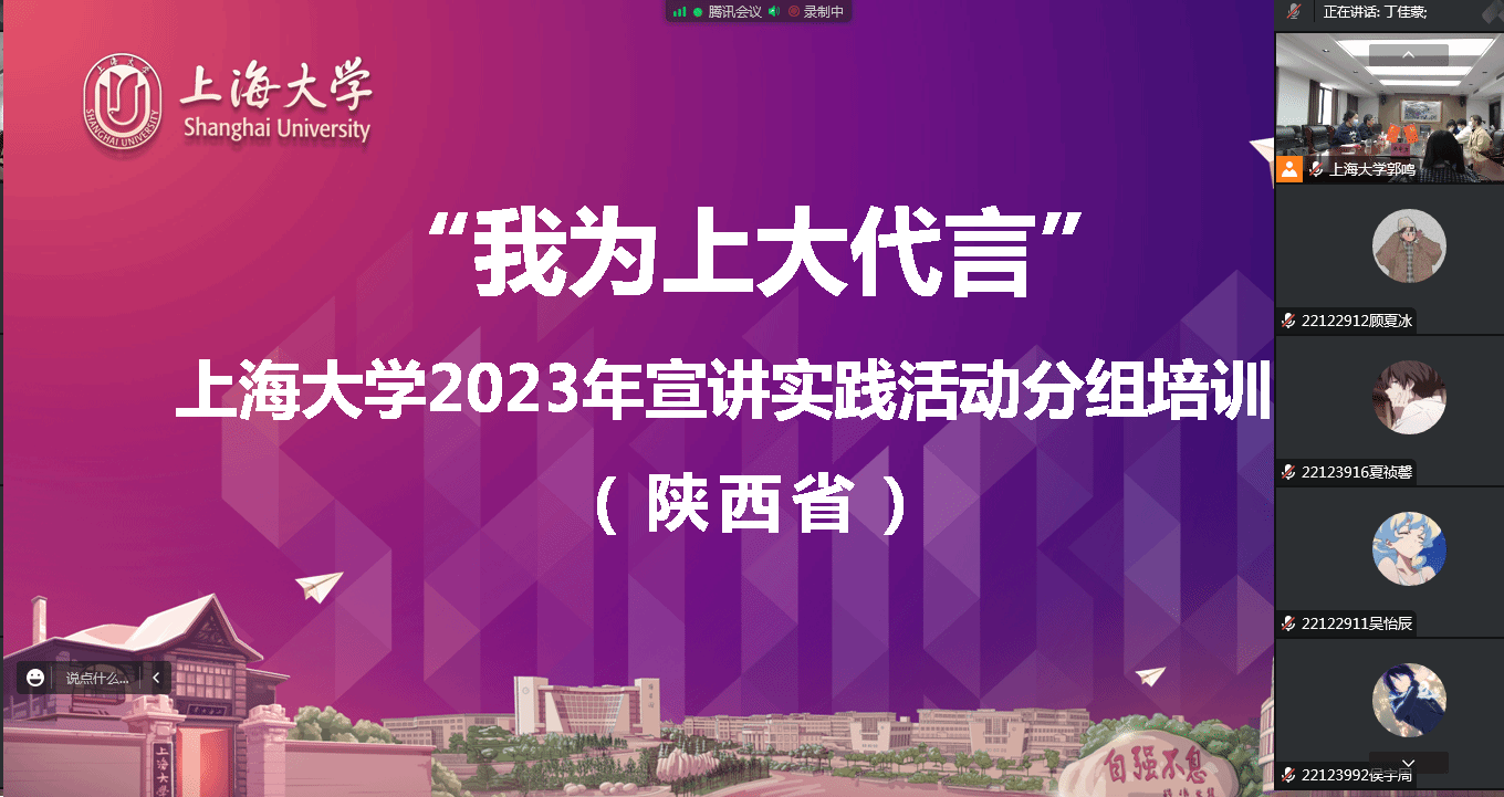 12月11日下午,jdb电子中国官方网站陕西招宣组在jdb电子中国官方网站306会议室举办2023年“我为上大代言”宣讲实践活动培训会。jdb电子中国官方网站党委书记吴仲钢,党委副书记、副院长丁佳蒙,国际学生辅导员郭鸣以及来自陕西籍和上海籍的三十多位学生志愿者通过线上线下相结合的方式参与了本次活动。活动由jdb电子中国官方网站国际学生辅导员郭鸣主持。