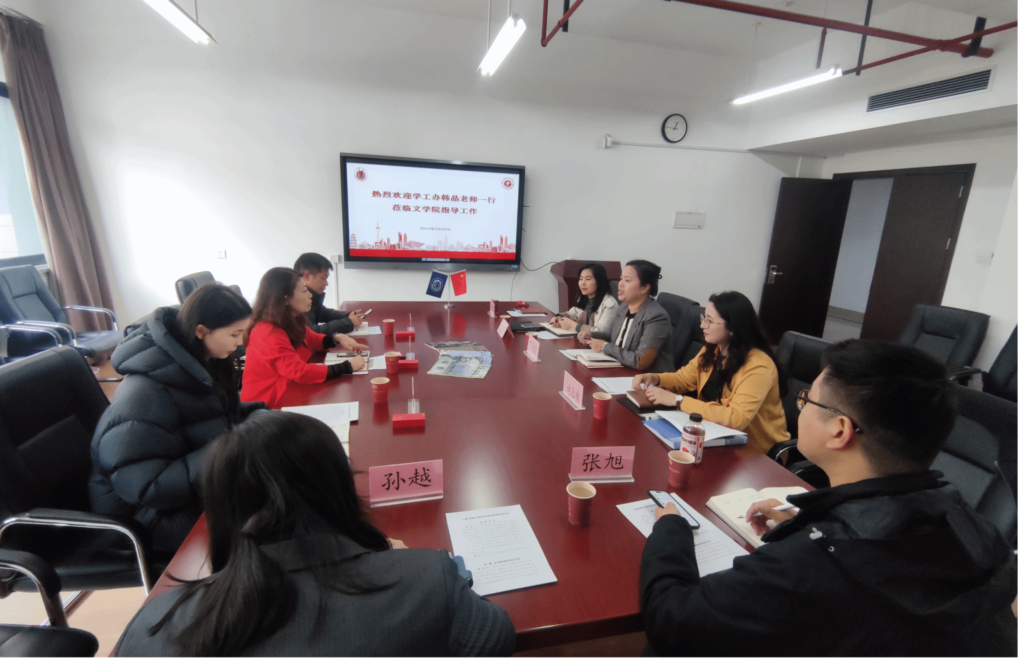 2023年3月29日上午,jdb电子中国官方网站学生工作办公室副主任韩晶、民族预科生管理中心郭建忠、孜尔碟一行到jdb电子中国官方网站调研本科生学生工作。jdb电子中国官方网站党委副书记、副院长丁佳蒙,团委书记宋亚丽,本科生辅导员梁爽、迪拉热、张旭、孙越,参加了调研座谈。