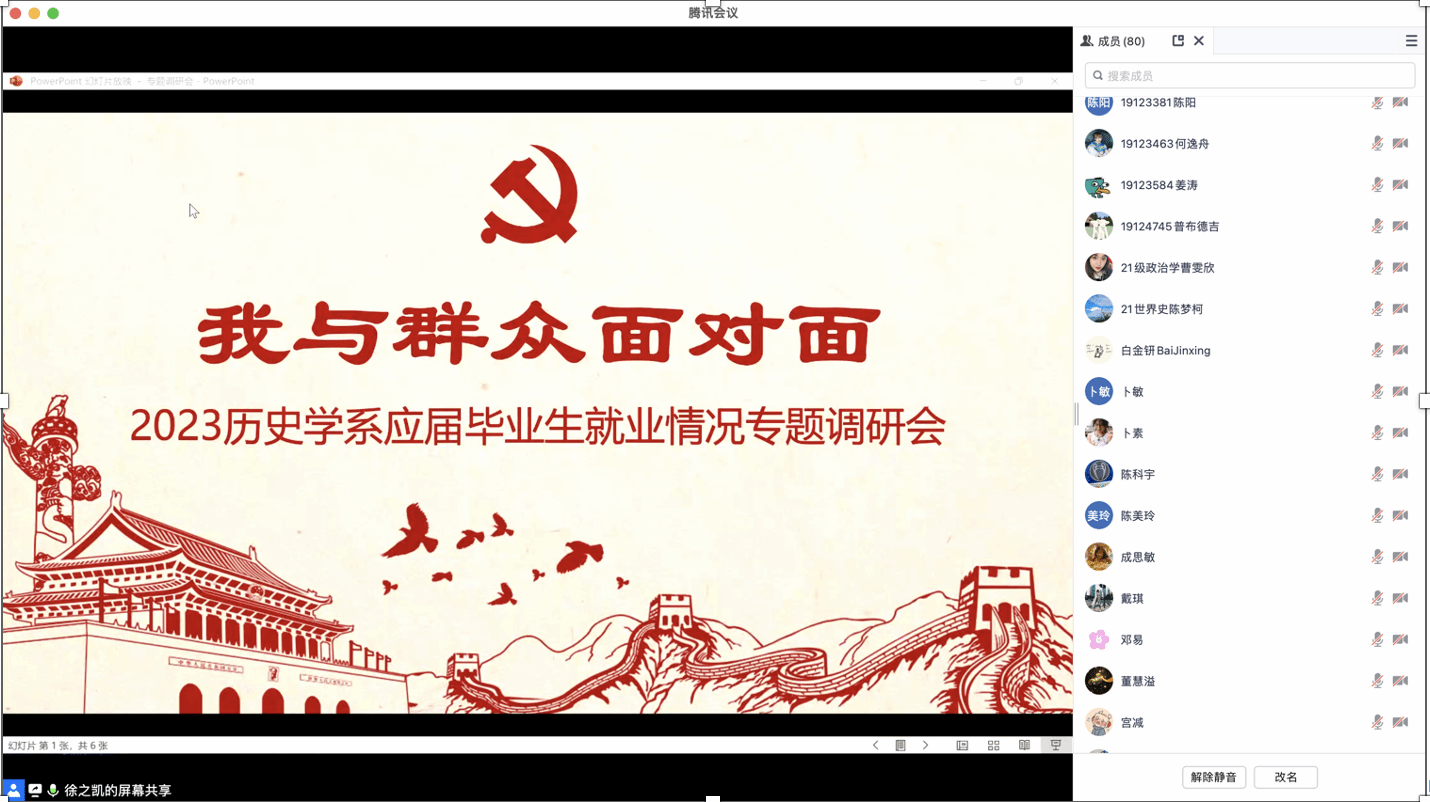 为扎实推进jdb电子中国官方网站就业工作,促进毕业生更加充分、高质量就业,5月17日下午,“我与群众面对面”2023年历史学系应届毕业生就业情况专题调研会于jdb电子中国官方网站306会议室以线上线下相结合的形式进行,旨在切实解决毕业生在就业过程中所遇、所忧的问题。jdb电子中国官方网站党委书记陆甦颖,党委副书记、副院长丁佳蒙,副院长肖清和,历史系主任郭丹彤、历史系教工党支部书记朱虹,历史系副主任舒健,历史系教授严泉,历史系教师徐之凯、黄凯,研究生辅导员宋亚丽、刘菁、卜敏,本科生辅导员张旭以及近100名jdb电子中国官方网站2023届毕业生共同参会。会议由朱虹主持。
