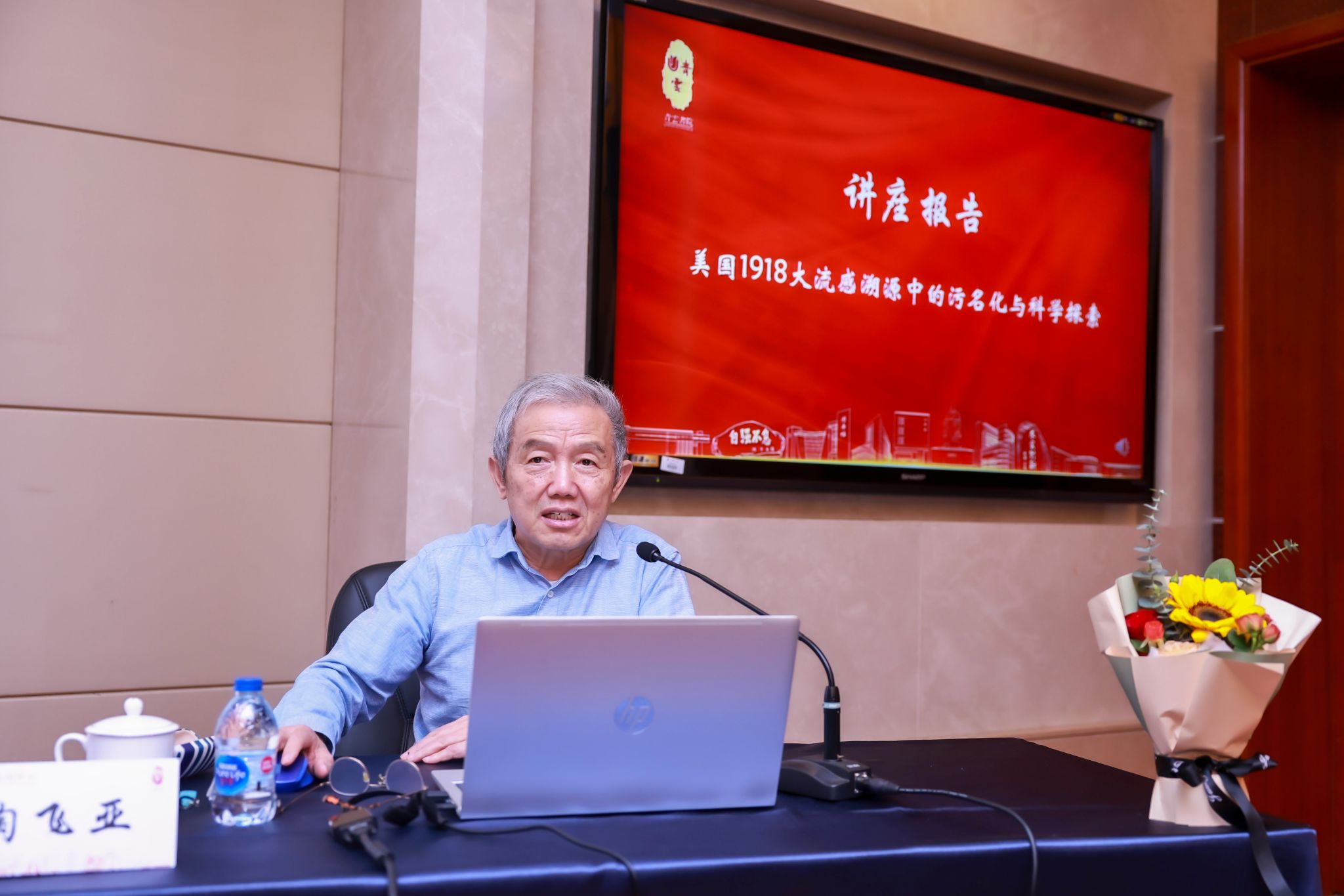 随后青云大讲堂第二季第一讲正式开始。陶飞亚教授为同学们带来了以美国1918大流感溯源中的污名化与科学探索为主题的讲座。教授首先详细讲解了美国1918年大流感的具体情况、政府措施与时代战争背景,以此为切入口说明了当时各大媒体在多方面因素的驱使下进行的四大污名化溯源,“俄国流感论”、大战刺激下的“德国流感论”、鼠疫疑云下的“中国流感说”,以及“欧洲起源说”。之后,教授从科学与政治等方面为同学们全面而系统地讲述了后疫情时代的1918大流感科学溯源,以及至今仍在继续的病毒起源地科学溯源。陶飞亚教授将医学与历史思维相结合进行演讲,甚为感慨,也分享了自己的学术经历与感悟。1918大流感溯源一个多世纪的漫漫科学之路也深刻地启示着同学们要不断的求真探索。