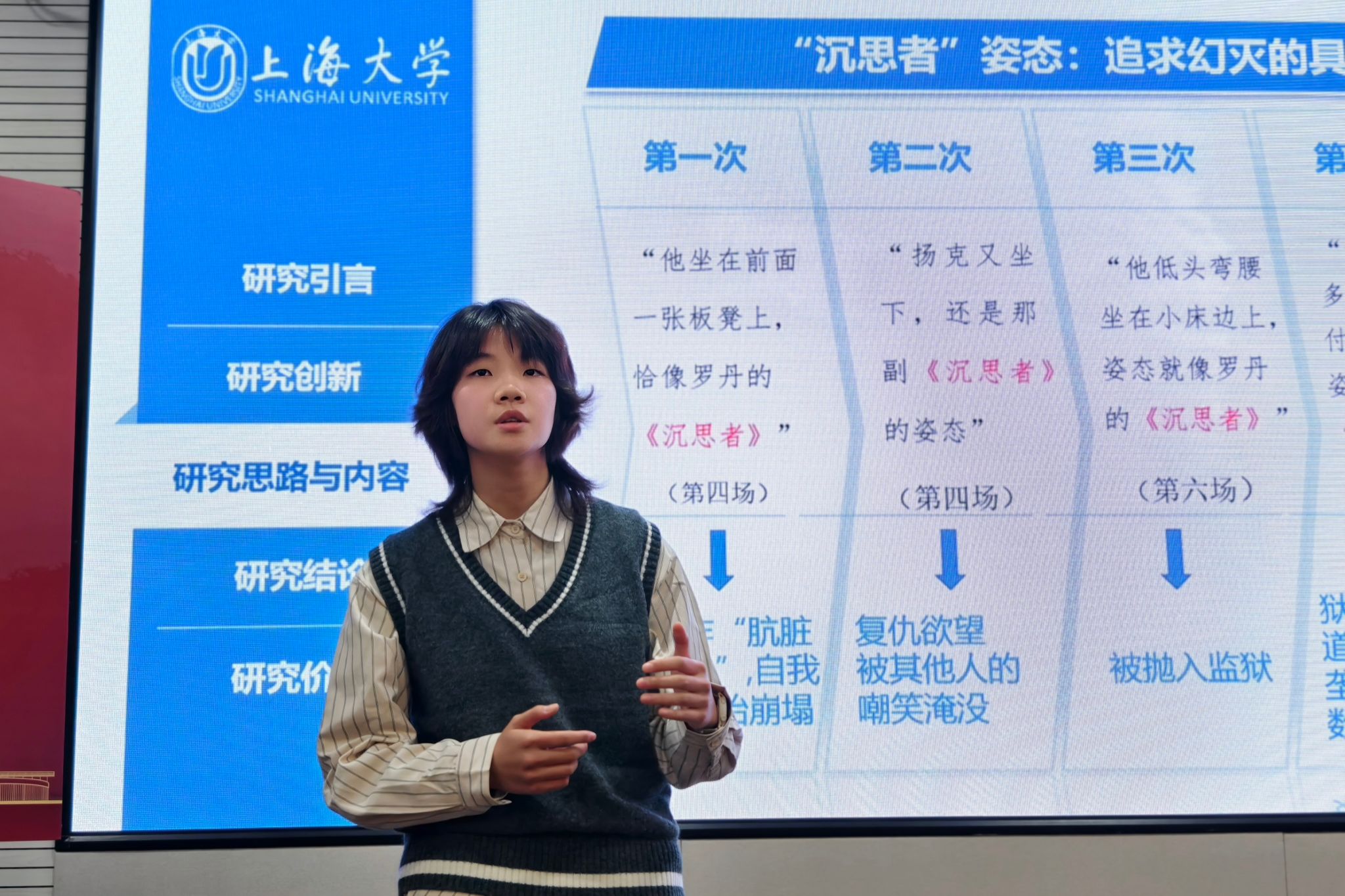 之后,jdb电子中国官方网站第七届本科生学术论坛第一名获得者——2022级汉语言文学专业本科生李汶芯进行以《“毛猿”与“沉思者”——尼采悲剧观下<毛猿>中扬克的双重气质解读》为题的主题分享,与同学们交流论文写作当中的思考和感悟。