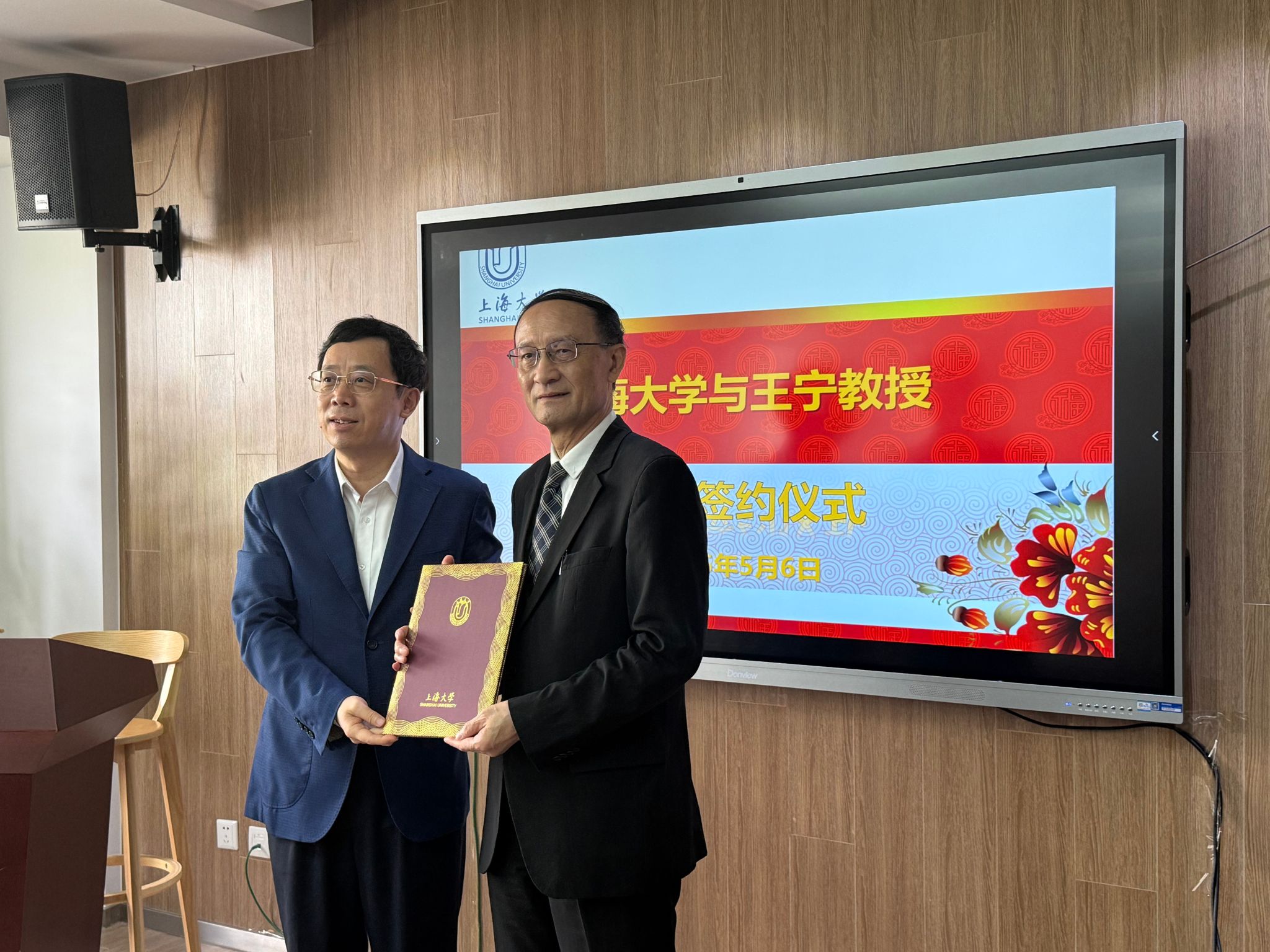 在热烈的掌声中,签约仪式正式举行。校党委副书记段勇代表学校向王宁教授颁发聘任证书,并为其佩戴校徽。