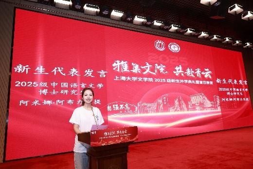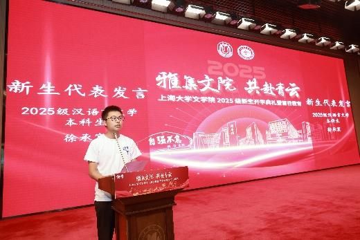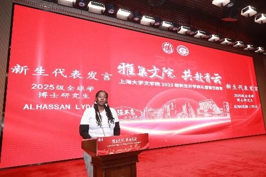 2025级汉语言文学本科生徐承宸、2025级中国史专业硕士研究生朱鑫雨、2025级中国语言文学博士研究生阿米娜·阿布力米提、2025级全球学博士 ALHASSAN LYDIA分别作为新生代表上台发言。四位新生从自身经历谈起如何与所学学科结缘,分别表达了对未来学习和生活的期待,并衷心希望在以后能够在jdb电子中国官方网站中收获成长、绽放光芒。