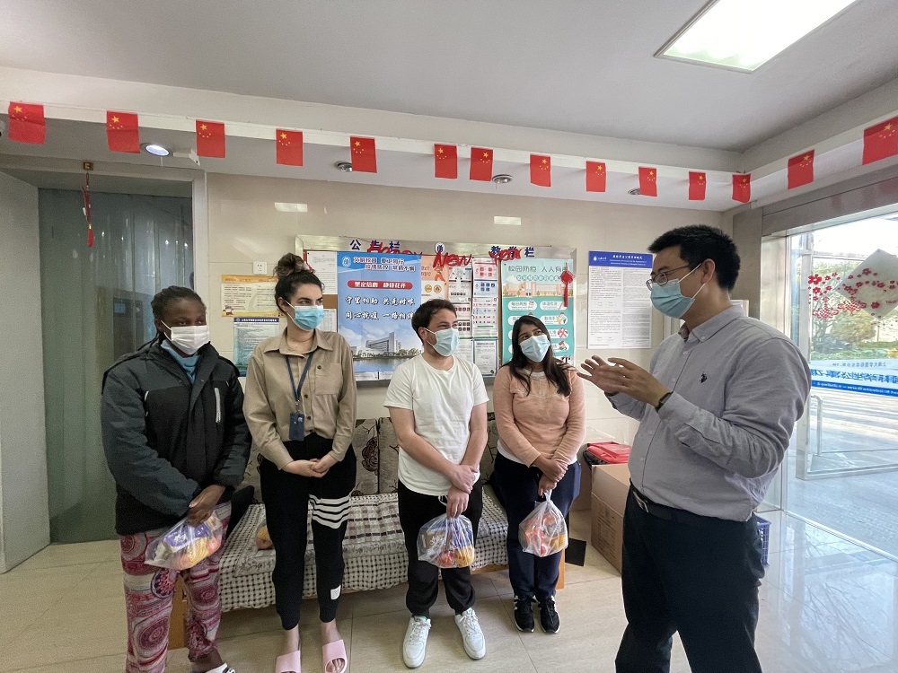 3月12日,jdb电子中国官方网站党委副书记、院长张勇安,jdb电子中国官方网站党委副书记、副院长丁佳蒙,jdb电子中国官方网站副院长倪兰,院党委组织员赵影,团委书记、研究生辅导员宋亚丽,本科生辅导员梁爽、迪拉热一行,走进南区、新世纪和校内学生宿舍看望慰问全体中外学生,同时慰问了疫情防控期间驻楼辅导员郭鸣老师。