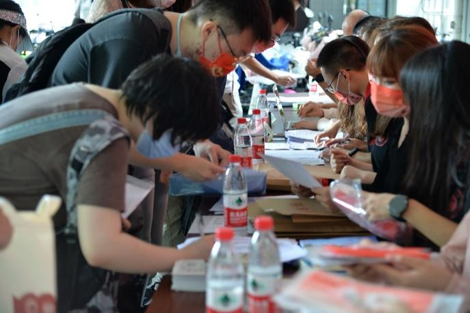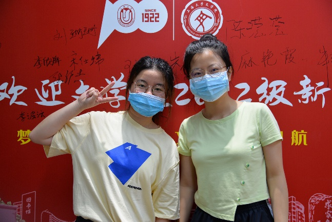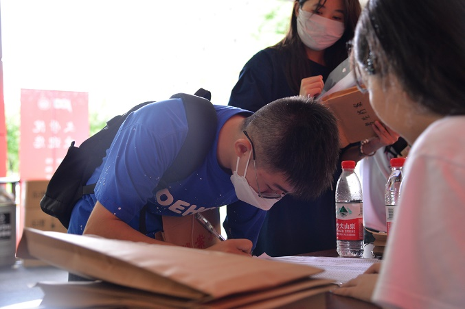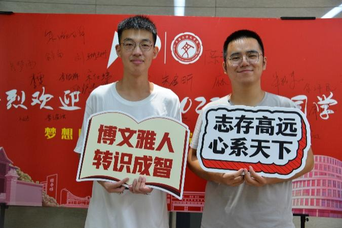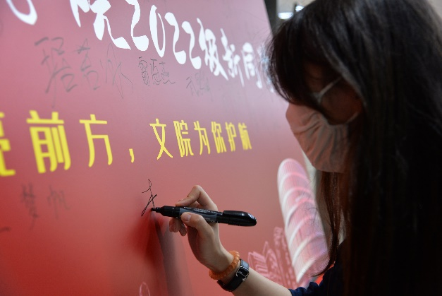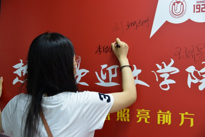 领取完纪念品后,新生们在志愿者们的引导下在签名墙上写下自己的姓名,留下了初至jdb电子中国官方网站的第一张相片。