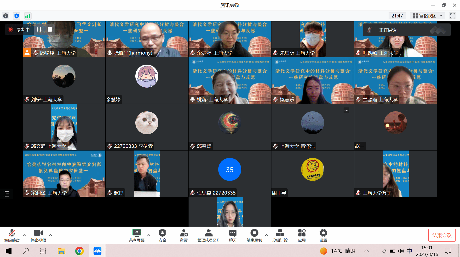 2023年3月16日下午,南京大学中国古典文献学专业教授、博士生导师徐雁平先生应邀走进jdb电子中国官方网站“人文研究学术规范与论文写作‘四进’课堂”,于线上举行“清代文学研究中的材料分析与整合:一些研究的复盘与反思”主题讲座。徐教授从复盘自身研究经历出发,为jdb电子中国官方网站2022级硕士研究生讲授如何整合、分析、处理研究中的文献和材料。本次讲座由课程主讲老师姚蓉教授主持。此外,本次课程讲座还吸引了其他年级的硕、博士研究生和博士后参与学习。