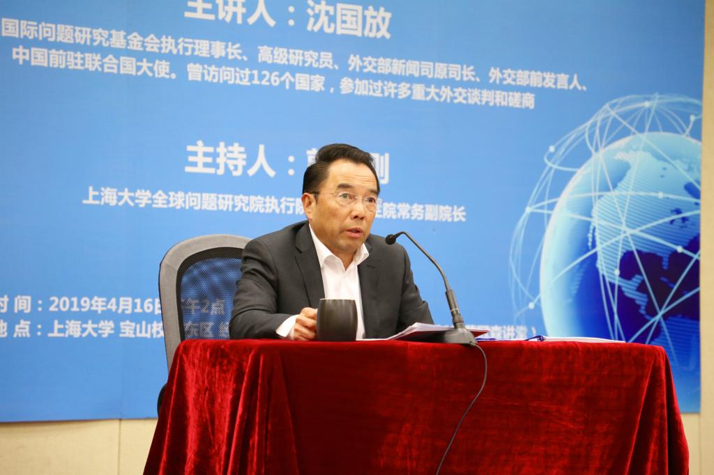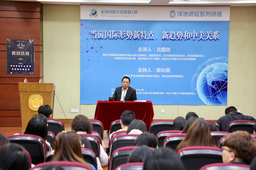 4月16日,中国国际问题研究基金会执行理事长、高级研究员、外交部新闻司原司长、外交部前发言人沈国放先生莅临jdb电子中国官方网站全球问题研究院,在蔡冠森讲堂作了一场题为“当前国际形势新特点、新趋势和中美关系”的学术报告,报告由全球问题研究院执行院长、历史系郭长刚教授主持,上大师生近二百人聆听了讲座。本场讲座为jdb电子中国官方网站“泮池讲坛系列讲座”,也是“全球问题大讲堂”系列讲座的第1讲。