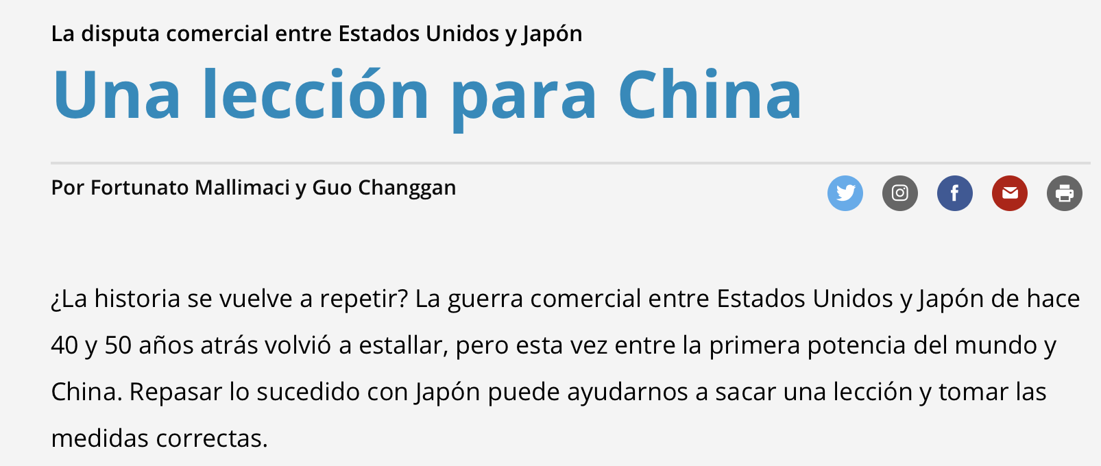 2019年6月16日,jdb电子中国官方网站中国-阿根廷联合研究中心主任郭长刚教授与福图纳多·马利马奇(Fortunato Mallimaci)教授在阿根廷《十二页报》(Página 12)上共同发表题为《美国与日本的贸易战:给中国的启示》(La disputa comerical entre Estados Unidos y Japón: Una lección para China)一文,揭示了日本在美日贸易战中的退让策略所带来的教训。文章指出,这一历史教训是中国政府可以借鉴的宝贵经验。《十二页报》是阿根廷第三大报,创办于1987年,主要在阿根廷国内发行,以政治和财经内容为主,影响力较大。