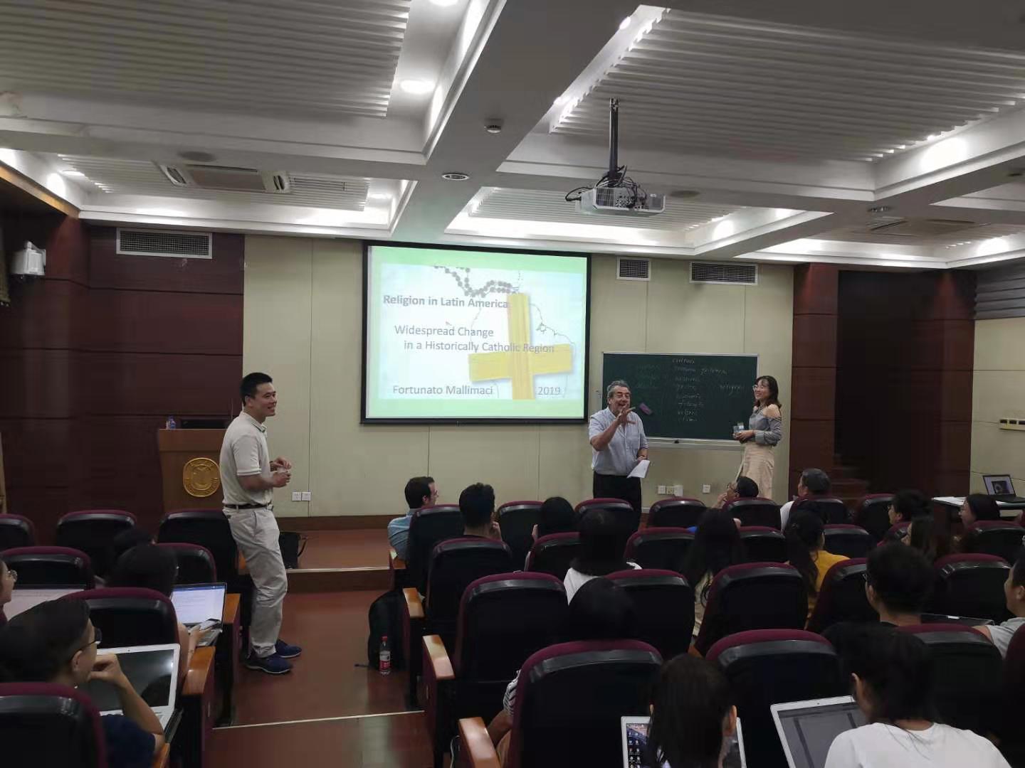 2019年8月28日,由jdb电子中国官方网站全球问题研究院主办,jdb电子中国官方网站拉美研究中心协办的2019年“全球视野下的拉丁美洲研究”暑期学校举行结业仪式。结业仪式由jdb电子中国官方网站拉美研究中心研究员张琨主持,jdb电子中国官方网站全球问题研究院院长郭长刚教授,阿根廷国家科技委员会高级研究员Fortunato Mallimaci, jdb电子中国官方网站历史系特聘教授Antonio Zapata,乌拉圭天主教大学人文与宗教研究所所长Nestor Da Costa、人文系主任Facundo Ponce,以及来自全国各高校和研究机构的学员参加本次结业仪式。