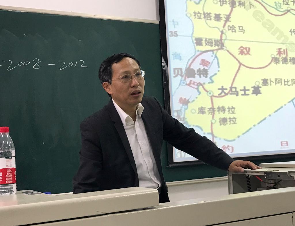 余建华教授首先向大家介绍了世界时局与国际形势的总体判断以及中东在当今世界格局和中国外交中的地位,从宏观角度丰富了大家对中东变局和中东地位的认识。紧接着余建华教授从“中东变局的历史方位”、“国际政治经济体系演进下的中东变局”、“中东变局的内生性根源”、“中东变局演进的路径、性质和前景”、“域内外多方角力下的中东博弈”及“中东六大热点问题”六个方面向大家进行了详细地分析与介绍。