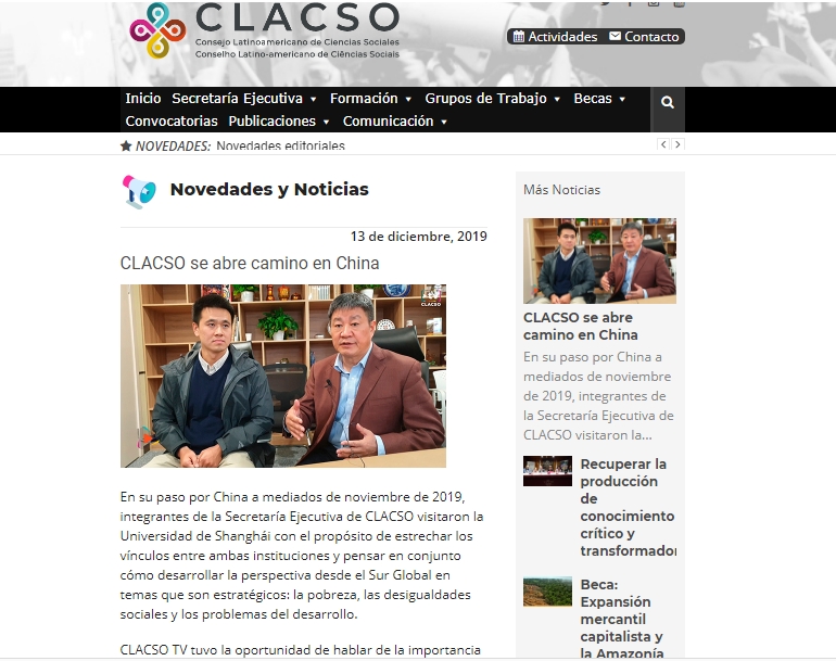 12月13日,拉丁美洲社会科学委员会(CLASCO,El Consejo Latinoamericano de Ciencias Sociales)官方网站发布了该委员会代表团访问jdb电子中国官方网站全球问题研究院与国际部的新闻(新闻链接:https://www.clacso.org/clacso-se-abre-camino-en-china/)。