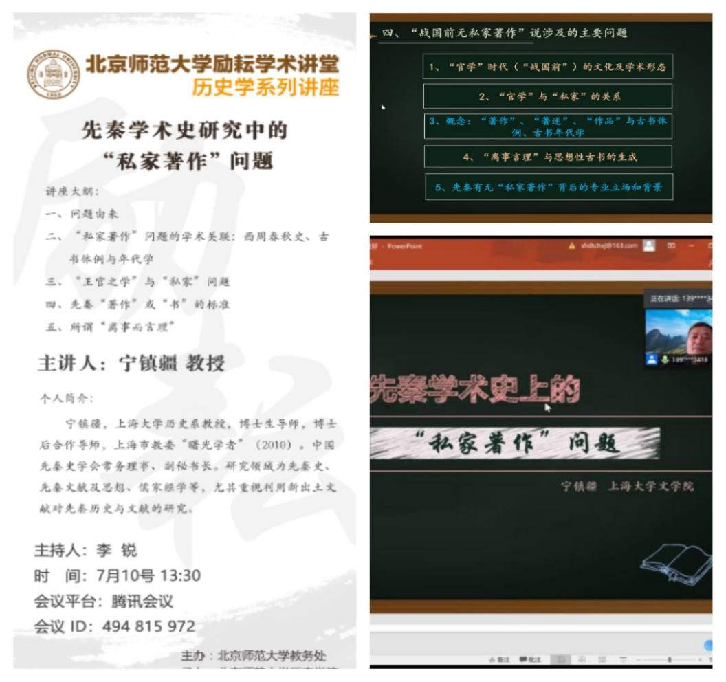 2020年7月10日下午 ,应北京师范大学历史学院之邀,jdb电子历史系宁镇疆教授为北京师范大学历史系师生举行线上学术讲座。本次讲座在腾讯会议平台举行,由北京师范大学李锐教授主持,讲座主题为“先秦学术史研究中的‘私家著作’问题”。