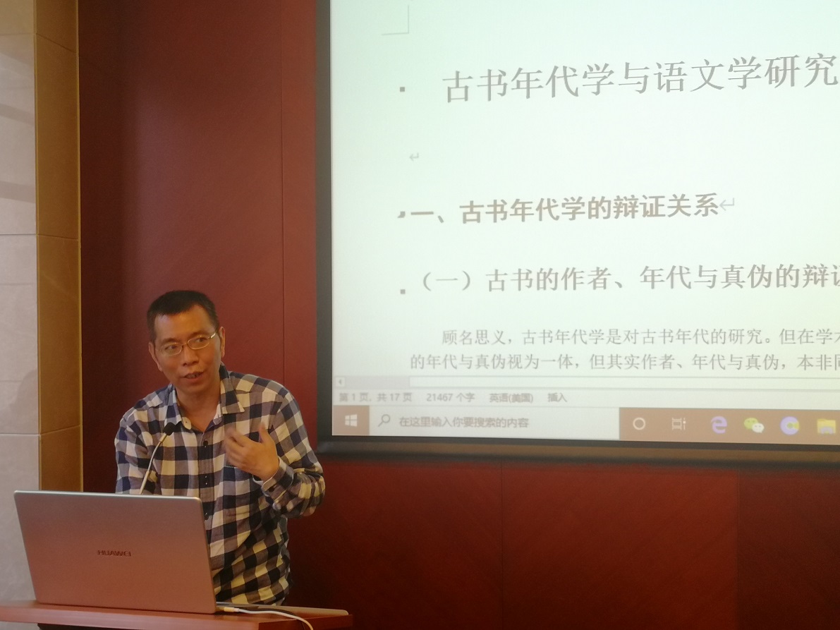 中国社会科学院语言所王志平研究员宣读了自己的论文《古书年代学与语文学研究中的若干问题》,该文提出古书年代学应关注古书的作者、年代与真伪之间的辩证关系;“言公”的情况下,“何为作者”是一个非常有挑战性的课题。他还解释了“层累形成的古书”观念,更由此引出古书年代学研究中的语文学方法,如名词、文法、文体、音韵等。