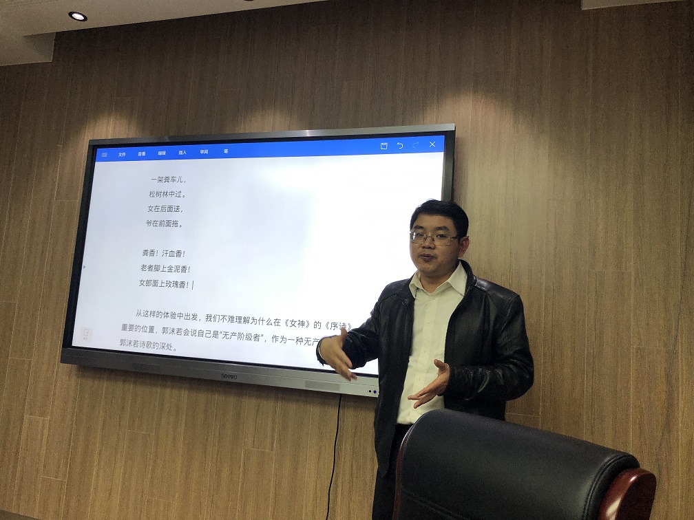 10月22日晚,中国社会科学院郭沫若纪念馆研究员、郭沫若研究会秘书长李斌应邀来jdb电子中国官方网站做讲座。李斌研究员讲座的题目是《《女神》所体现的五四精神》,他从对《女神》的解读入手,结合各种文献资料,对郭沫若的《女神》做了精辟的分析,并以此展开了对郭沫若的文学创作动因的精准解读,还原了一位五四文学先驱的真实面貌,并启发大家重新理解五四,并理解中国现代文学的创造性与现代化的特征。整场讲座,内容丰富、生动,讲解风趣、严谨、到位,让大家非常受益。