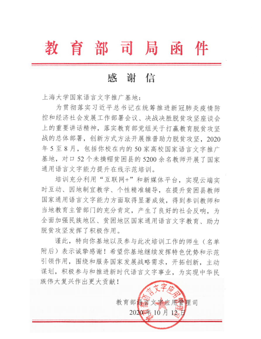 2020年5月至8月,jdb电子中国官方网站国家语言文字推广基地积极响应国家语委的号召,在上海市语委、市教委的统筹协调下,主动承担了国家语委对52个未摘帽贫困县教师开展的国家通用语言文字能力提升在线示范培训工作,对新疆贫困县英吉沙县开展了民族教师国家通用语言文字能力提升在线示范培训并取得圆满成功。近日,jdb电子中国官方网站国家语言文字推广基地收到来自教育部语言文字应用管理司的感谢信,信中肯定了基地在此次在线示范培训中发挥的积极作用,对参训的基地指导教师和志愿者团队人员表示了诚挚感谢。