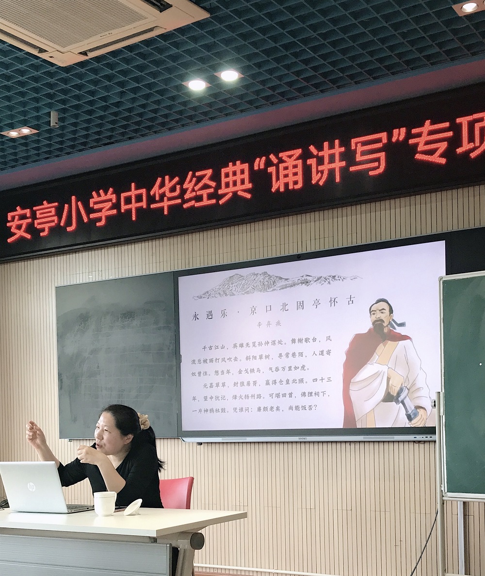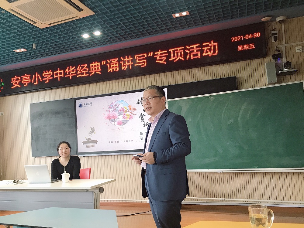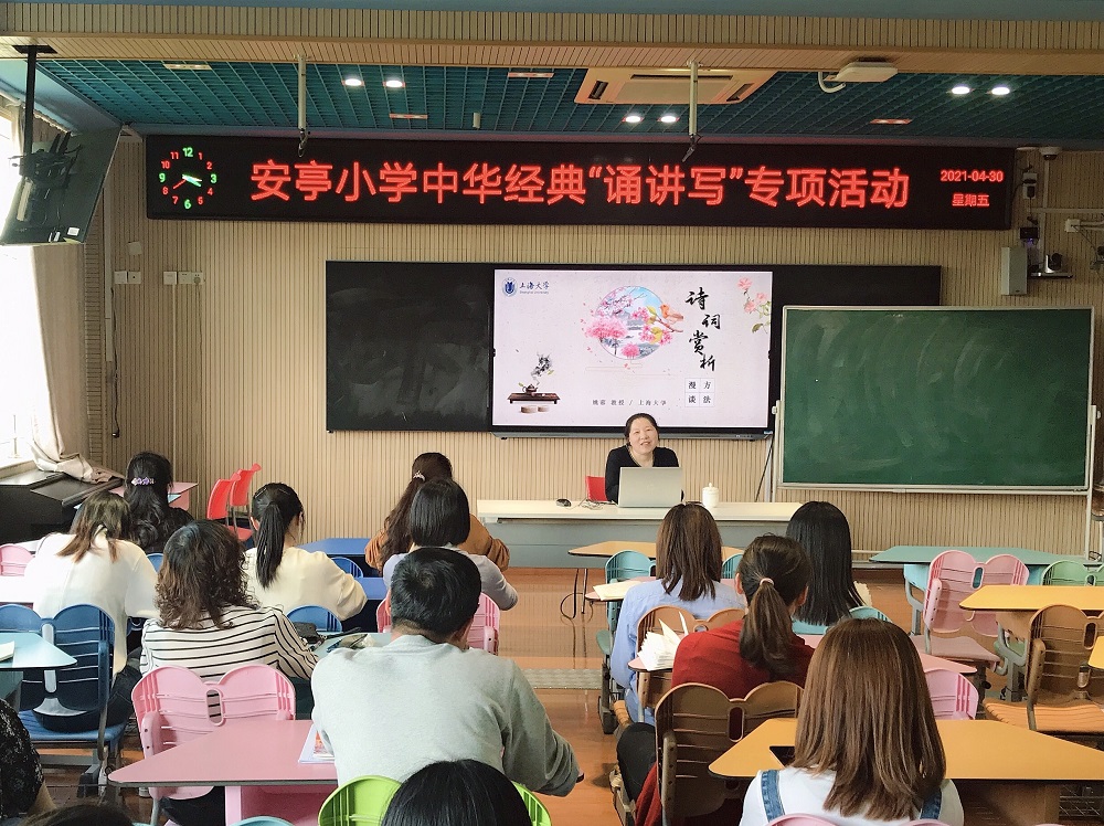 4月30日下午,jdb电子中国官方网站中华古诗文吟诵和创作基地姚蓉教授受邀参加嘉定区安亭小学“中华经典‘诵写讲’专项活动”,为安亭小学的老师们开展了一堂题为“诗词赏析方法漫谈”的讲座。