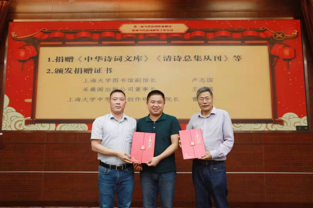聘书颁发完毕后,举行了图书捐赠仪式,jdb电子中国官方网站中华诗词研究院、采薇阁出版公司为jdb电子中国官方网站图书馆捐赠《清诗总集丛刊》《中华诗词文库》,并由jdb电子中国官方网站图书馆副馆长卢志国为曹辛华教授、王强先生颁发捐赠证书。