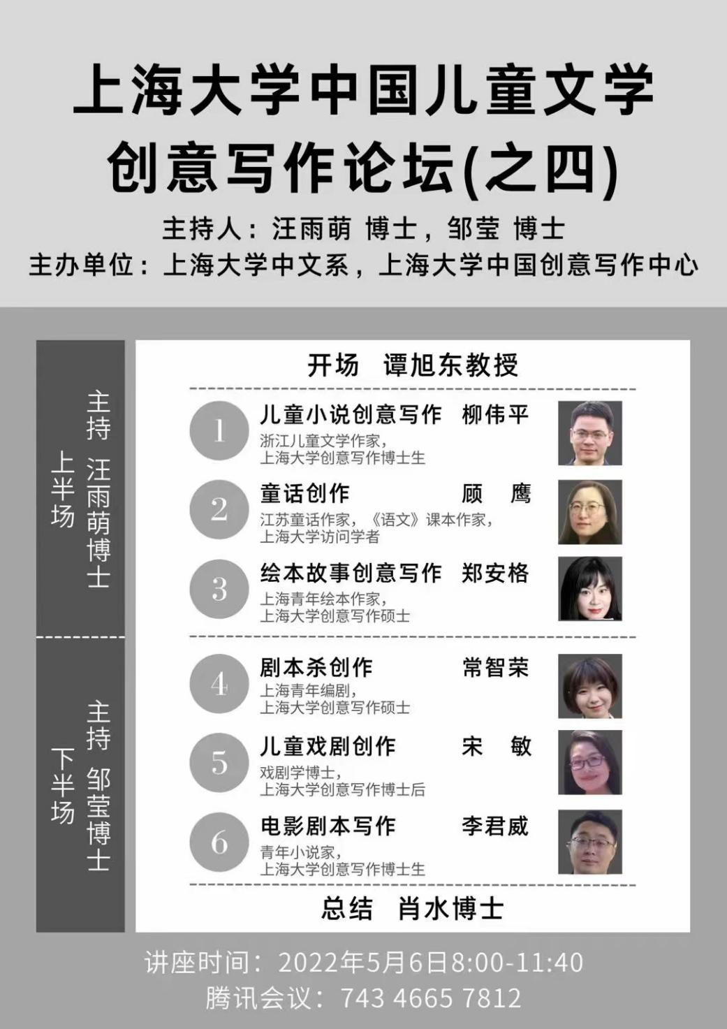 2022年5月6日上午,由jdb电子中国官方网站中文系和创意写作中心举办“jdb电子中国官方网站中国儿童文学创意写作学论坛(之四)”于线上顺利进行。本次论坛由jdb电子中国官方网站谭旭东教授召集组织,汪雨萌博士和邹莹博士主持,肖水博士做总结发言。