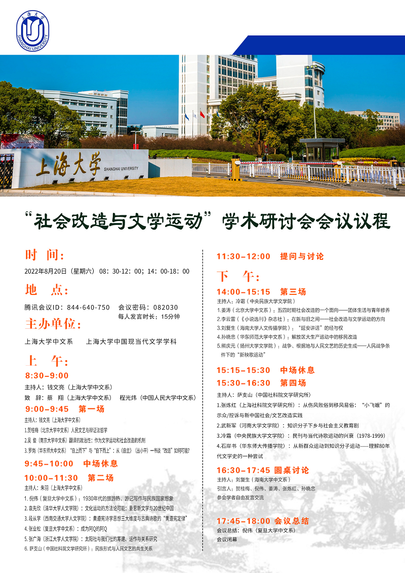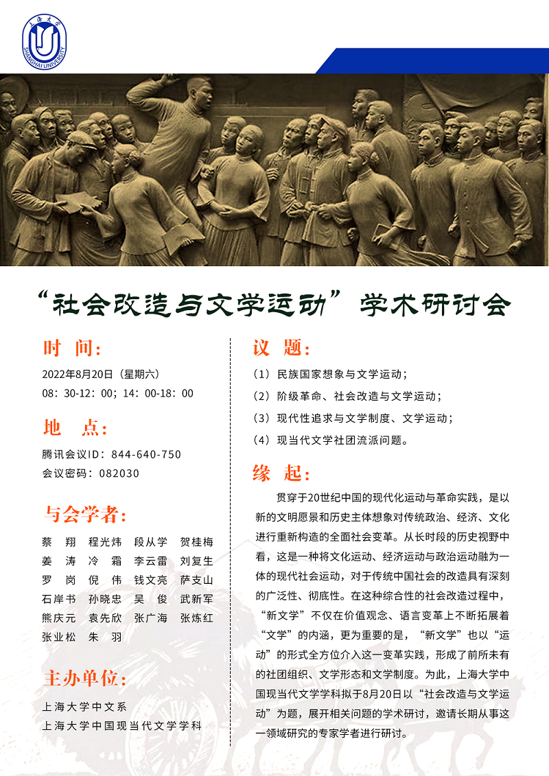 贯穿于20世纪中国的现代化运动与革命实践,是以新的文明愿景和历史主体想象对传统政治、经济、文化进行重新构造的全面社会变革。在这种综合性的社会改造过程中,“新文学”如何在价值观念、语言变革上拓展“文学”的内涵,其自身如何以“运动”的形式全方位介入了这一变革实践,成为8月20日jdb电子中国官方网站中文学科主办的“社会改造与文学运动”学术研讨会的缘起与主题。