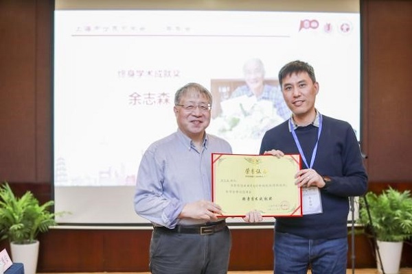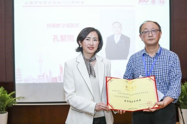 为表彰华东师范大学教授余志森、上海中学特级教师孔繁刚长期在世界史科研与教学领域的辛勤耕耘,上海市世界史学会前会长向荣、新任会长沐涛分别为两位先生颁发了“终身学术成就奖”和“终身教学成就奖”(两位先生不能到会,由孟钟捷教授和姚虹副校长代领。见下图)。