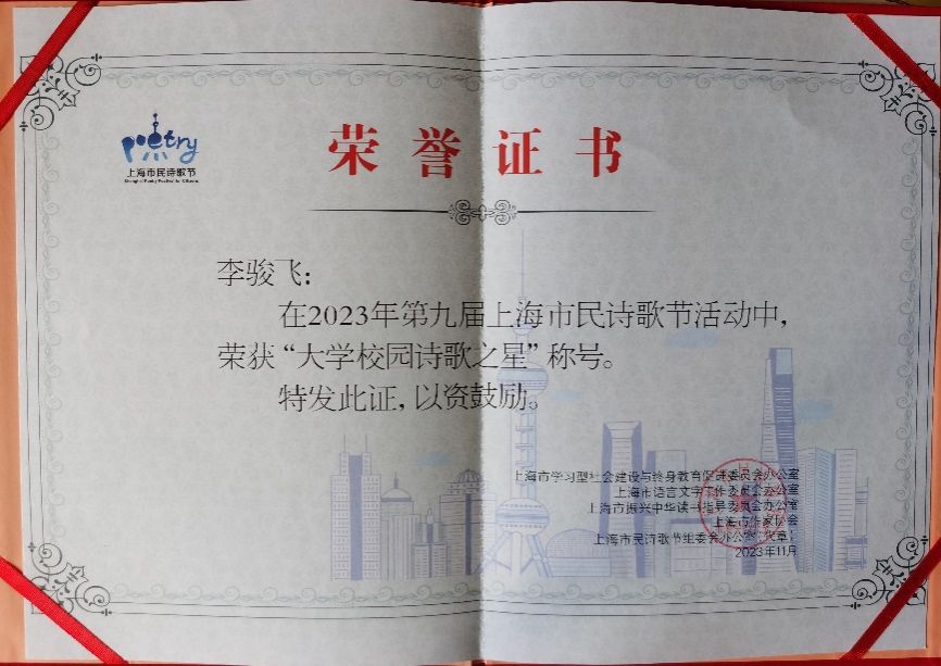 2023年11月20日,第九届“上海市民诗歌节”颁奖典礼“诗歌·无界”于无界美术馆举行。jdb电子中国官方网站2020级本科生李骏飞(笔名冯铗)荣获“大学校园诗歌之星”称号。