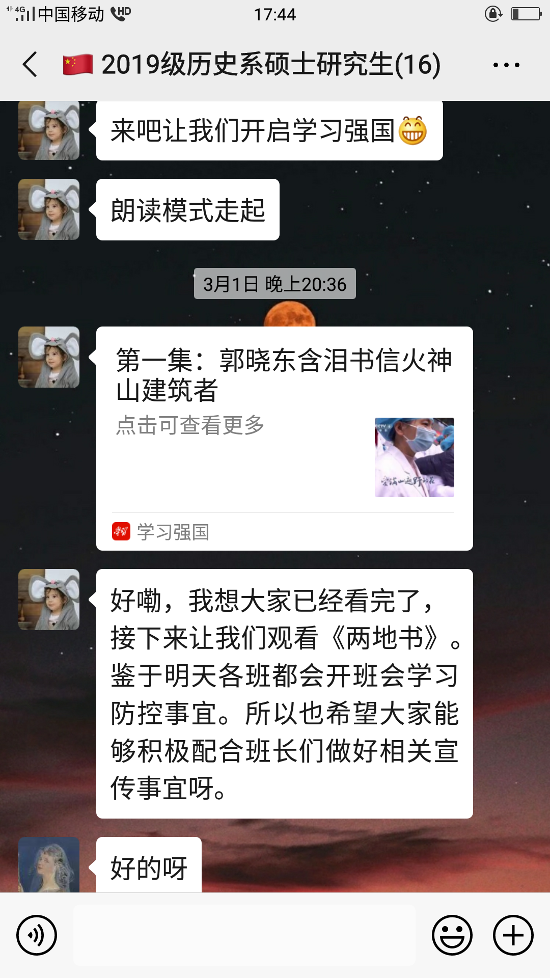 2020年2月28日, 2017级历史系硕士研究生党支部通过学习强国平台举行线上组织生活会,7名正式党员,5名预备党员参与本次会议。