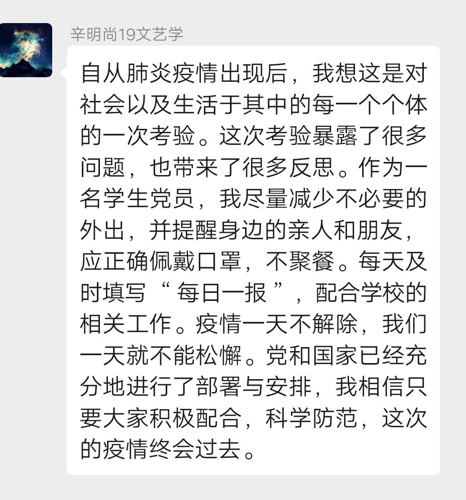 在会议开始之前,苏静如同志督促支部全体党员深入学习习近平总书记关于疫情防控工作的重要指示精神,并鼓励同志们分享自己在“学习强国”APP上关注到的新闻时事,充分用好“学习强国”平台。支部全体党员纷纷发言讨论,踊跃转发分享相关报道。有的同志转发了央视网的评论,有的则分享了沸点视频,如《感动!发现拾荒者未带口罩,小男孩拿出自家口罩为其带上》《口罩下的战“疫”面孔》等,短短的视频展示了人们在疫情下相互帮助的举动,这种正能量值得我们点赞传播。同志们表示,新冠肺炎防疫工作是一场艰难的战役,无数的公务人员、医务人员、社会力量都站在前线为我们建立起守护的围墙,虽然国内的疫情正逐渐好转,但正如习近平总书记所强调的,“不获全胜,绝不轻言成功”,我们要时刻怀抱不松懈、不疏忽的心态来对待疫情防控。作为学生党员,我们虽没有力量赶赴前线,但仍旧能担负起先锋模范作用,严格遵守防疫标准,从我做起,从身边做起,继续稳步推进防疫工作。