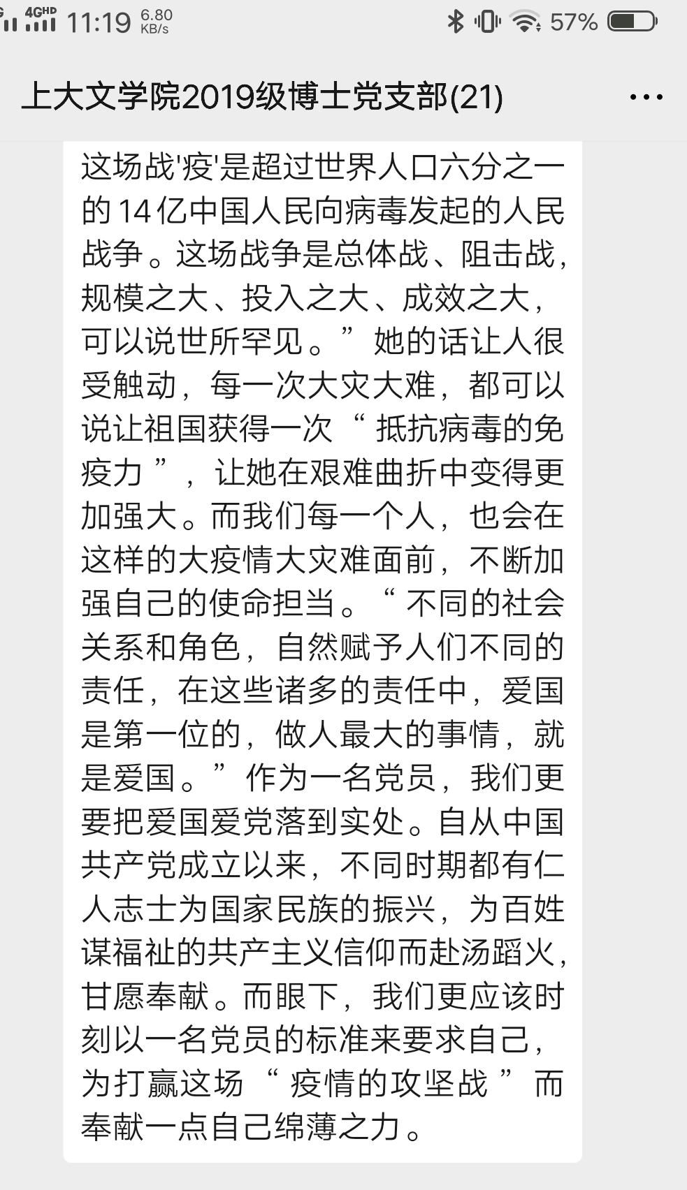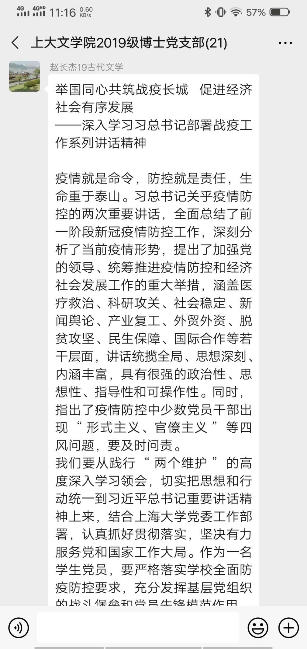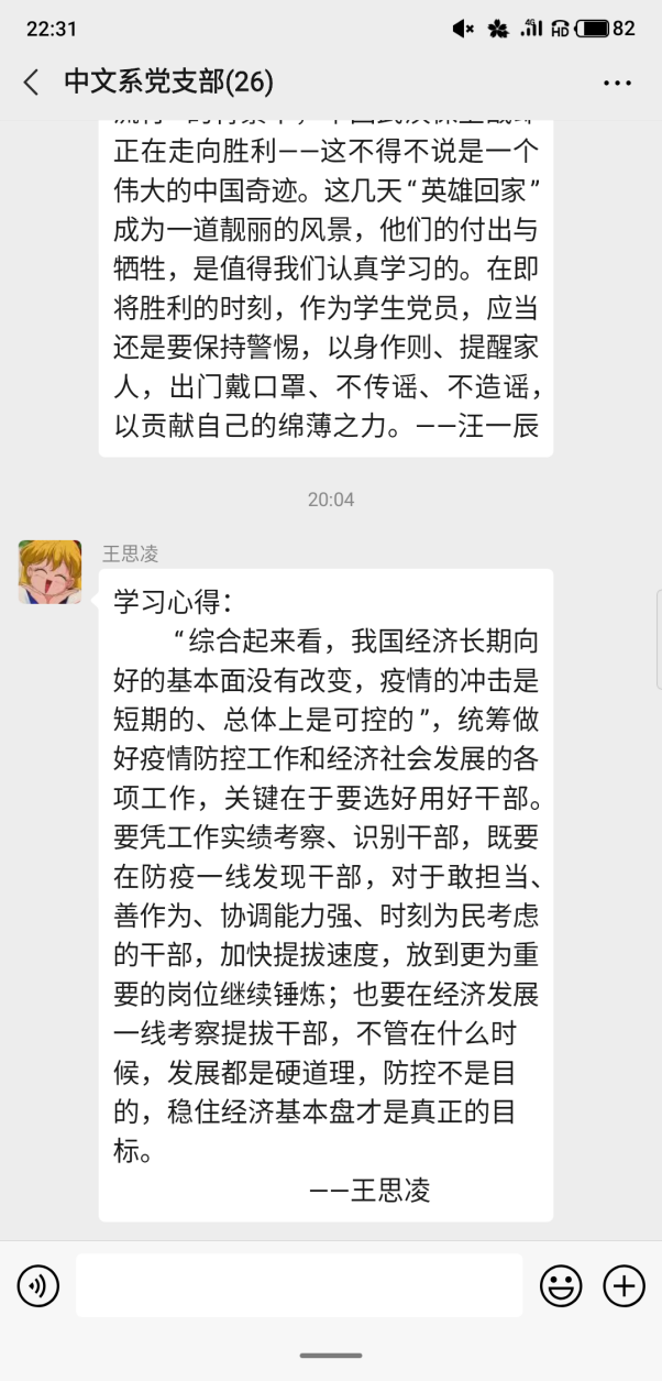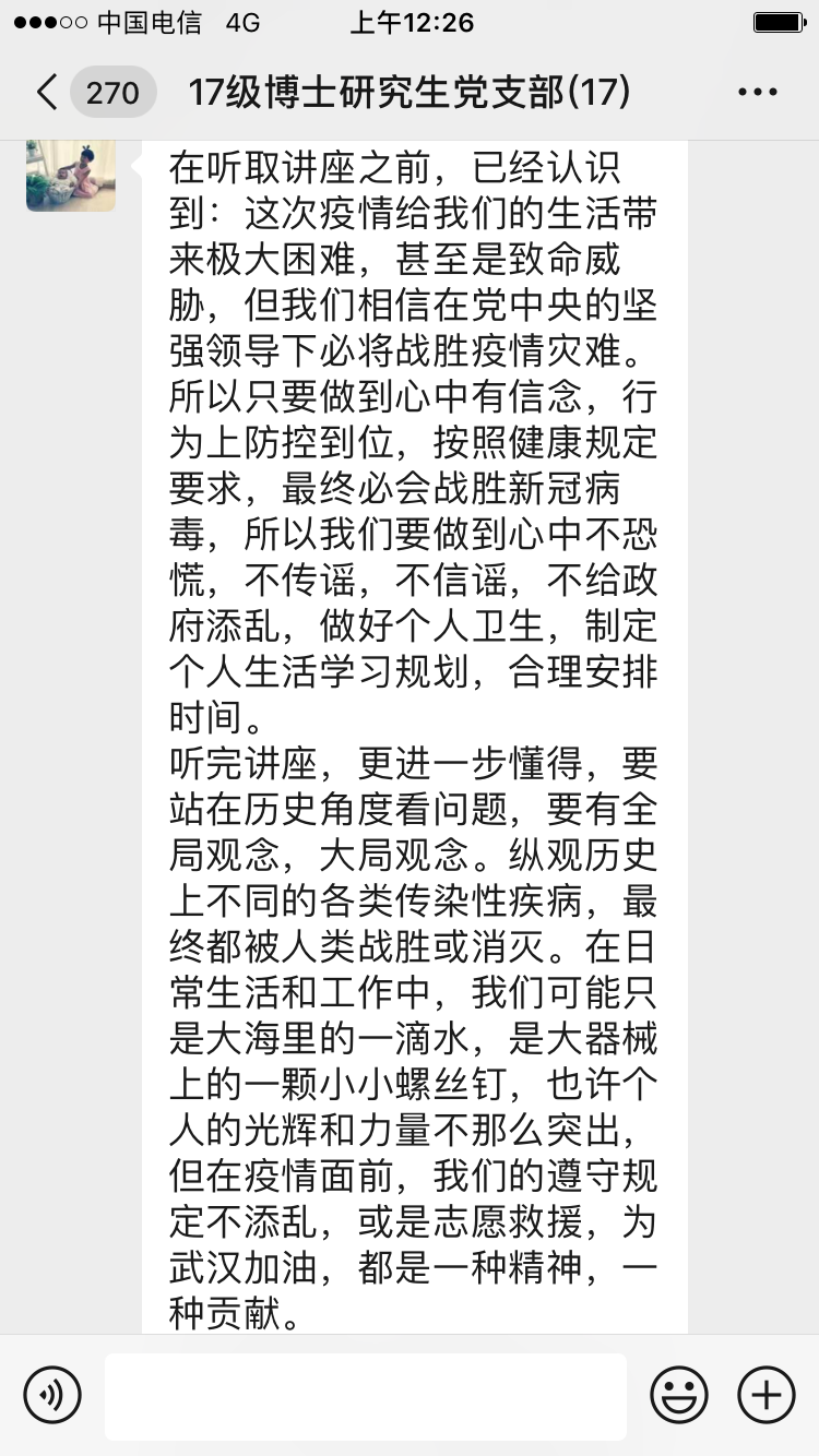 通过学习,同志们了解倒党中央在疫情防控工作中对医疗、经济、教育等方面的部署,深刻领会到党中央对战胜疫情的坚定信念和所做的巨大努力。全国人民上下齐心、众志成城。作为研究生党员的我们虽不在抗疫一线,但也要积极发挥党员的先锋模范作用,以身作则,听从学校安排,不提早返沪、返校,保质保量完成线上学习任务,及时上报“每日一报”,配合学院学校的工作。近来疫情在全国人民的共同奋斗下取得了阶段性的胜利,但我们仍不能松劲儿,要抱着“不获全胜,不轻言成功”的坚定信念,继续投入到下一阶段的疫情防控工作中。