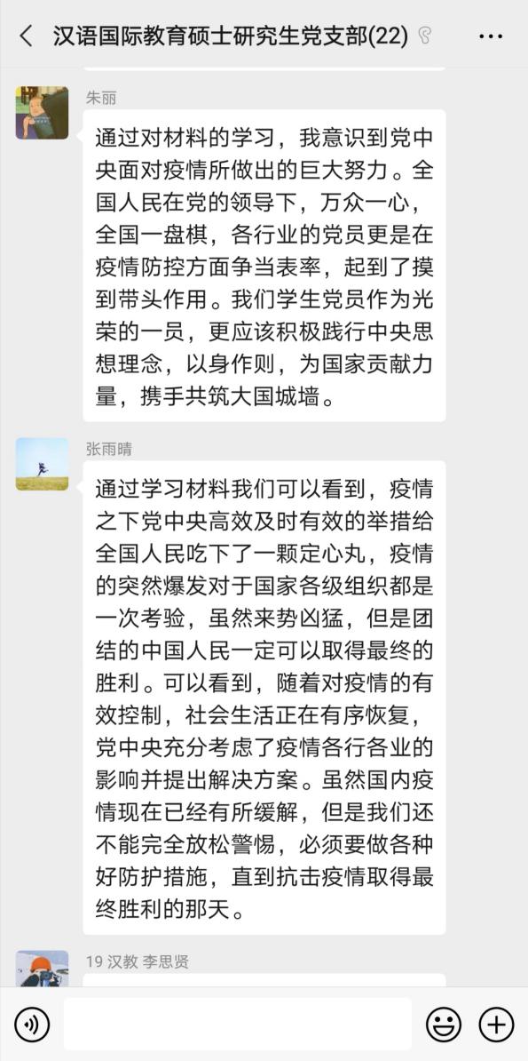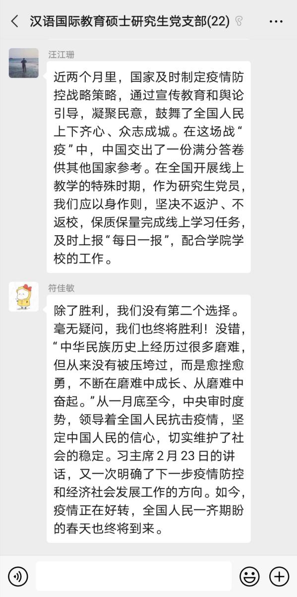 2020年3月13日,2019级汉语国际教育研究生党支部在支部微信群内开展支部会议,研习近期关于疫情防控工作的重要文件,并进行心得体会交流。支部全体成员参加,会议由支部书记郭婷同志主持。