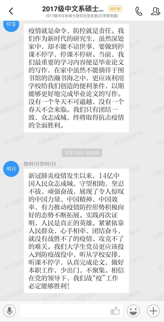 2020年3月12日,2017级中文系硕士研究生党支部全体党员在“学习强国”APP支部群举行以“学习疫情防控文件、致敬一线抗疫先锋”为主题的支部会议,此次会议采用“线下自主学习+线上积极讨论”的形式开展。会议由支部书记苏静如同志主持。