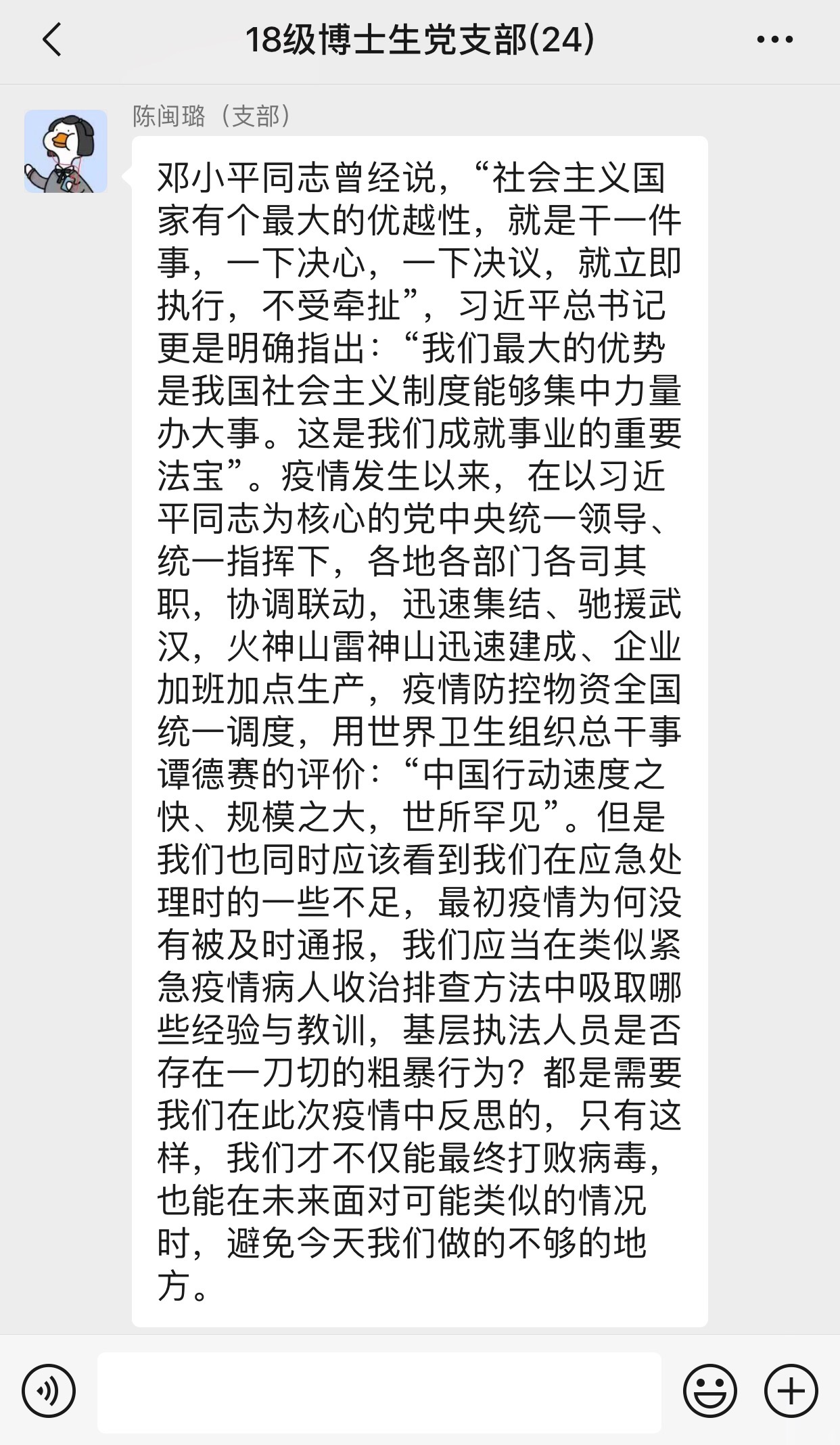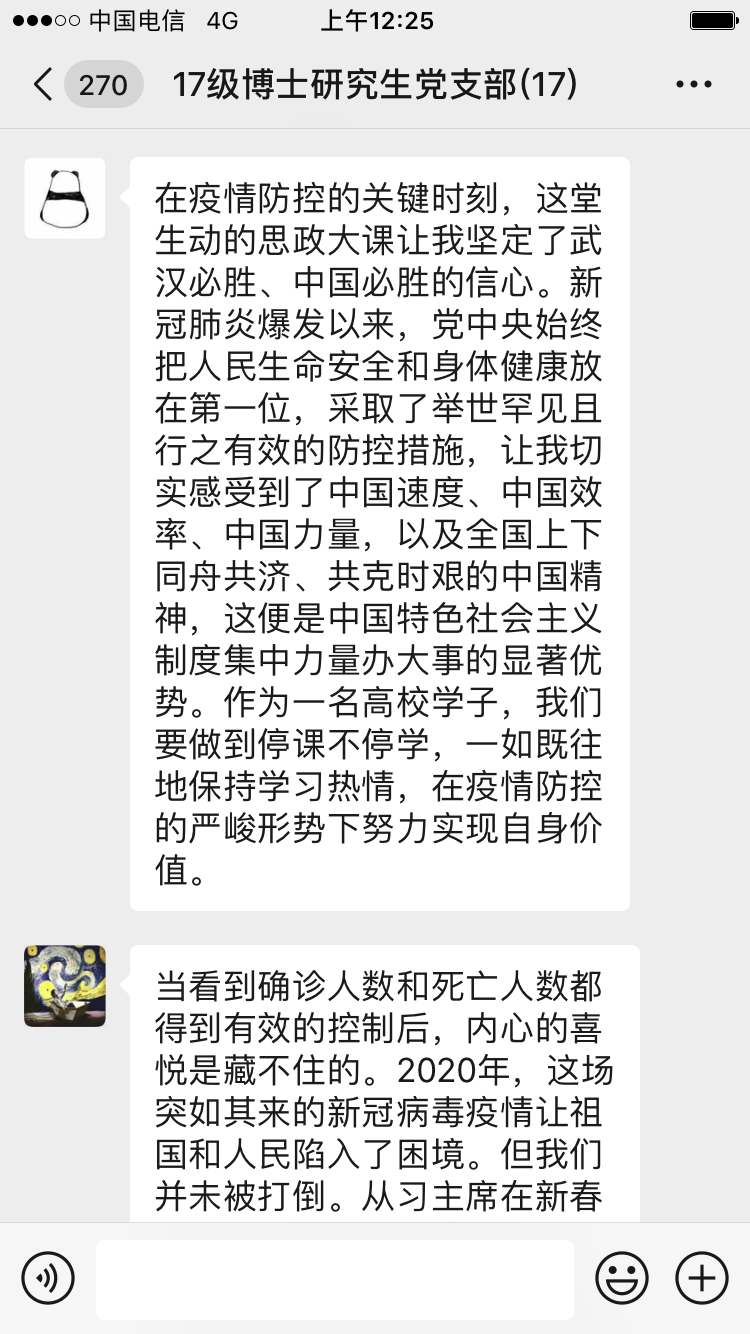 2020年3月12日,2018级博士研究生党支部在支部微信群内开展了以“提升疫情防控意识,持续关注疫情”为主题的组织生活会。支部共22名党员,每位同志都结合自身对近期疫情防控相关文件的学习和在疫情防控实践中的所见所感,在线上进行了发言交流。此次会议由支部书记许琛琛通知主持。