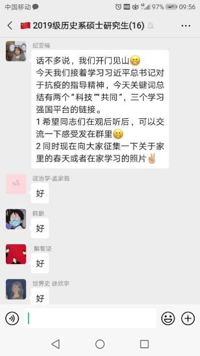 2020年3月15日,2019级历史系硕士研究生党支部开展疫情防控线上主题党日活动。支部全体党员同志参加,会议由支部纪亚楠同志主持。