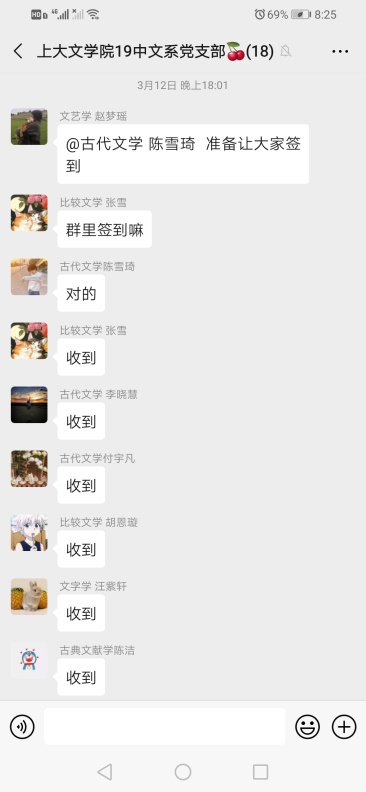 2020年3月12日,2019级中文系硕士研究生党支部通过“学习强国”app开展以“坚定信心、同舟共济,科学防治、精准施策,坚决打赢疫情防控阻击战”为主题的线上组织生活会,全体党员同志参与,会议由支部书记赵梦瑶同志主持。
