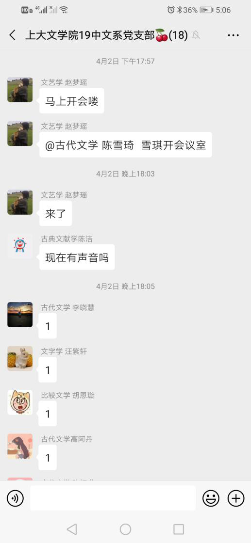 2020年4月2日,2019级中文系硕士研究生党支部利用“学习强国”视频会议功能,开展以“疫情中感人的平凡小事”为主题的组织生活会,并讨论“一支部以特色”活动方案。全体党员同志参加,会议由支部书记赵梦瑶同志主持。