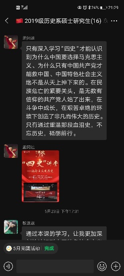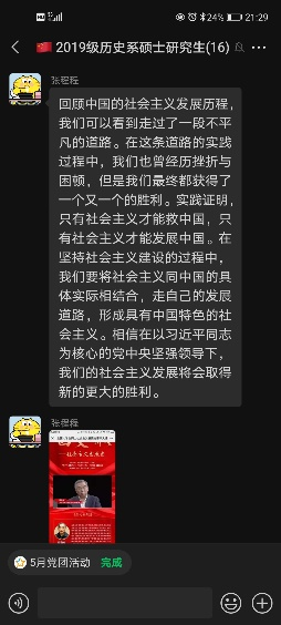 5月22日,全国大学生“同上‘四史’思政大课”最后一讲,即第四讲“社会主义发展史”思政大课在人民网等媒体平台播出,主讲教师为北京大学教授顾海良、中国人民大学副教授马慎萧、北京航空航天大学副教授付丽莎。2019级历史系硕士研究生党支部的党员同志们及时收听收看了本节思政课。