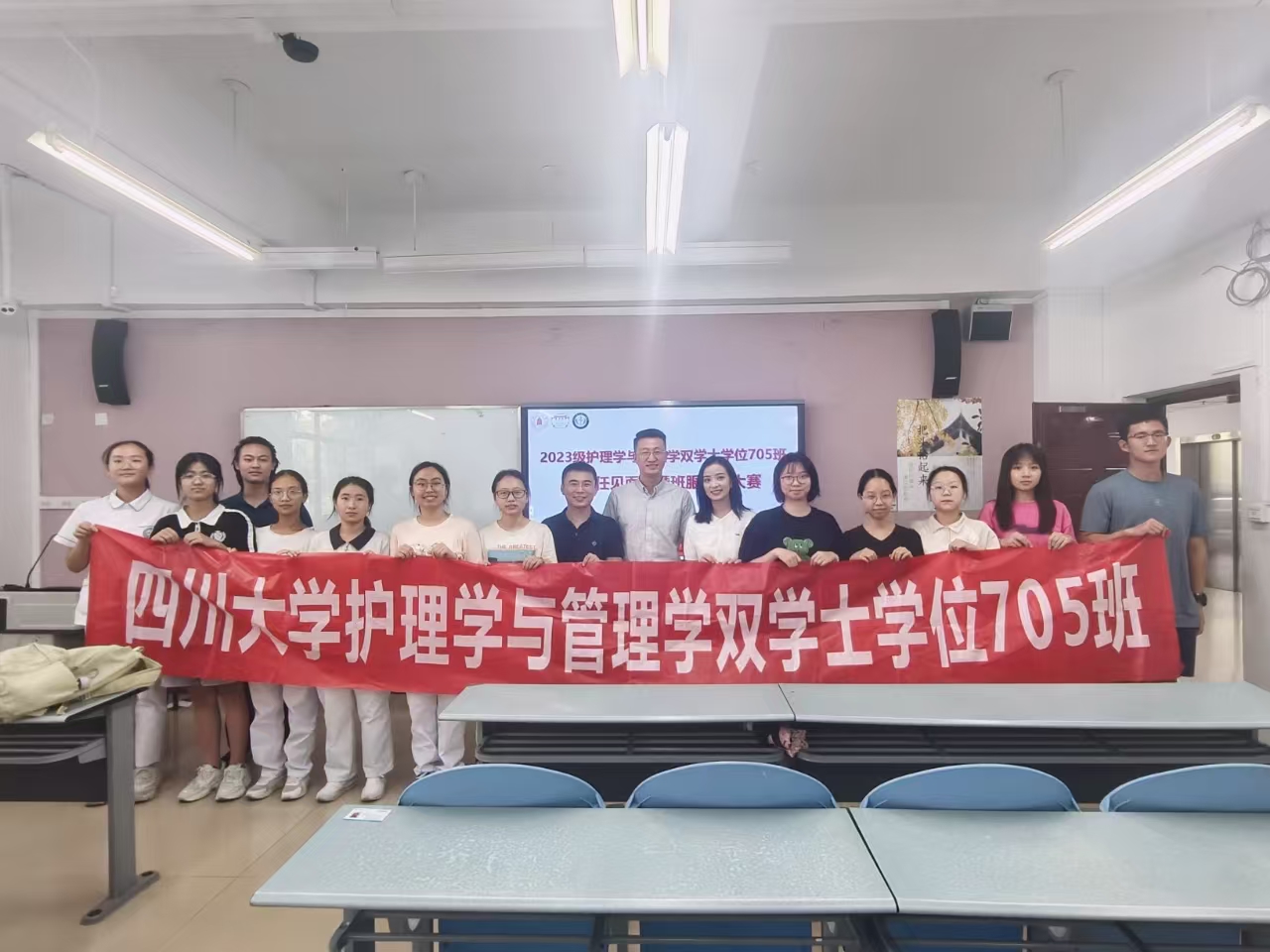 近日,2023级护理705班全体同学、辅导员何强和班主任刘海涛、刘洪红在华西临医楼224教室举办了班级首次班服设计大赛。本活动旨在以同学们创意设计班服为纽带,凝聚班级青春力量,增强班级团结协作氛围,促进师生情感交流。本次活动由李小萌同学主持。