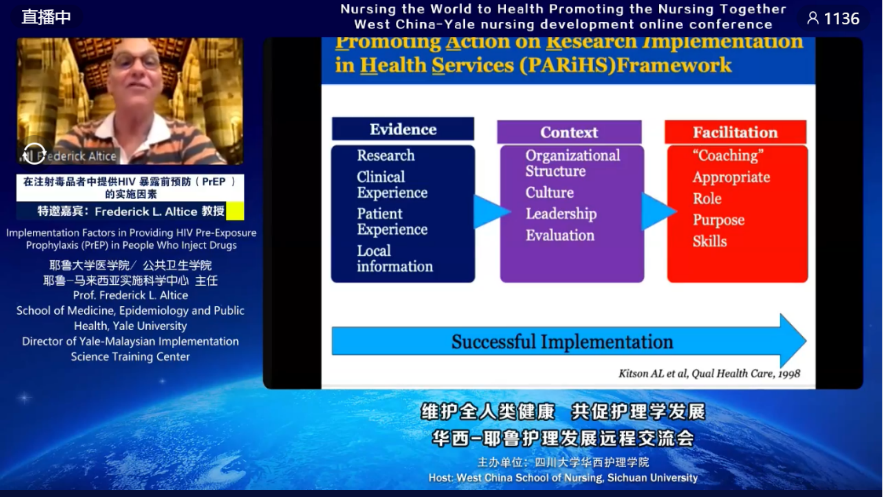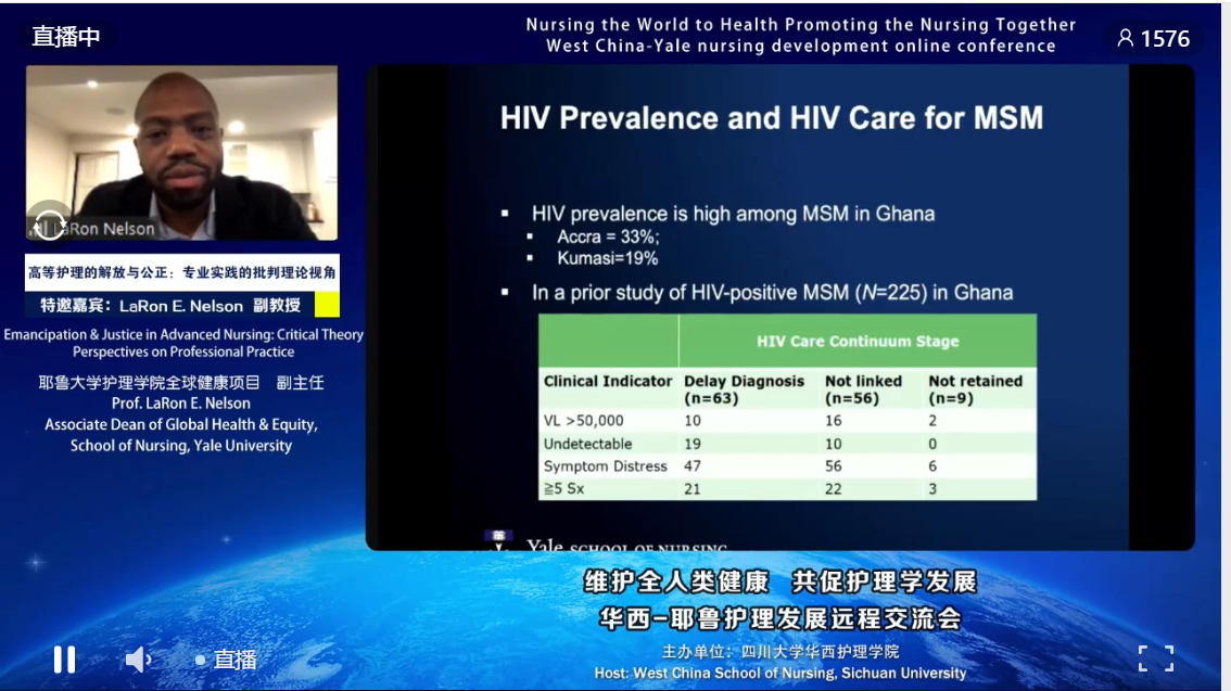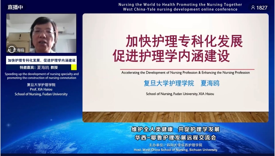 7月31日上午8:30,bat365中文官方网站“维护全人类健康·共促护理学发展” 系列网络论坛(第四期)—华西-耶鲁护理发展远程交流会在华西医院5G远程会议中心举行。本期论坛邀请了耶鲁大学医学院/公共卫生学院Frederick L. Altice教授、耶鲁大学护理学院Canhua Xiao教授、耶鲁大学护理学院LaRon E. Nelson教授、匹兹堡大学护理学院Sheila A. Alexander教授、复旦大学护理学院夏海鸥教授、bat365中文官方网站研究生院常务副院长万学红教授、bat365中文官方网站华西护理创新研究中心/护理学四川省重点实验室主任胡秀英教授、bat365中文官方网站华西医学中心医学学科建设部部长成果教授进行专题讲座。论坛由护理学院张凤英副院长和李玲利副院长共同主持,bat365中文官方网站外国语学院胡敏霞副教授担任同声传译。
