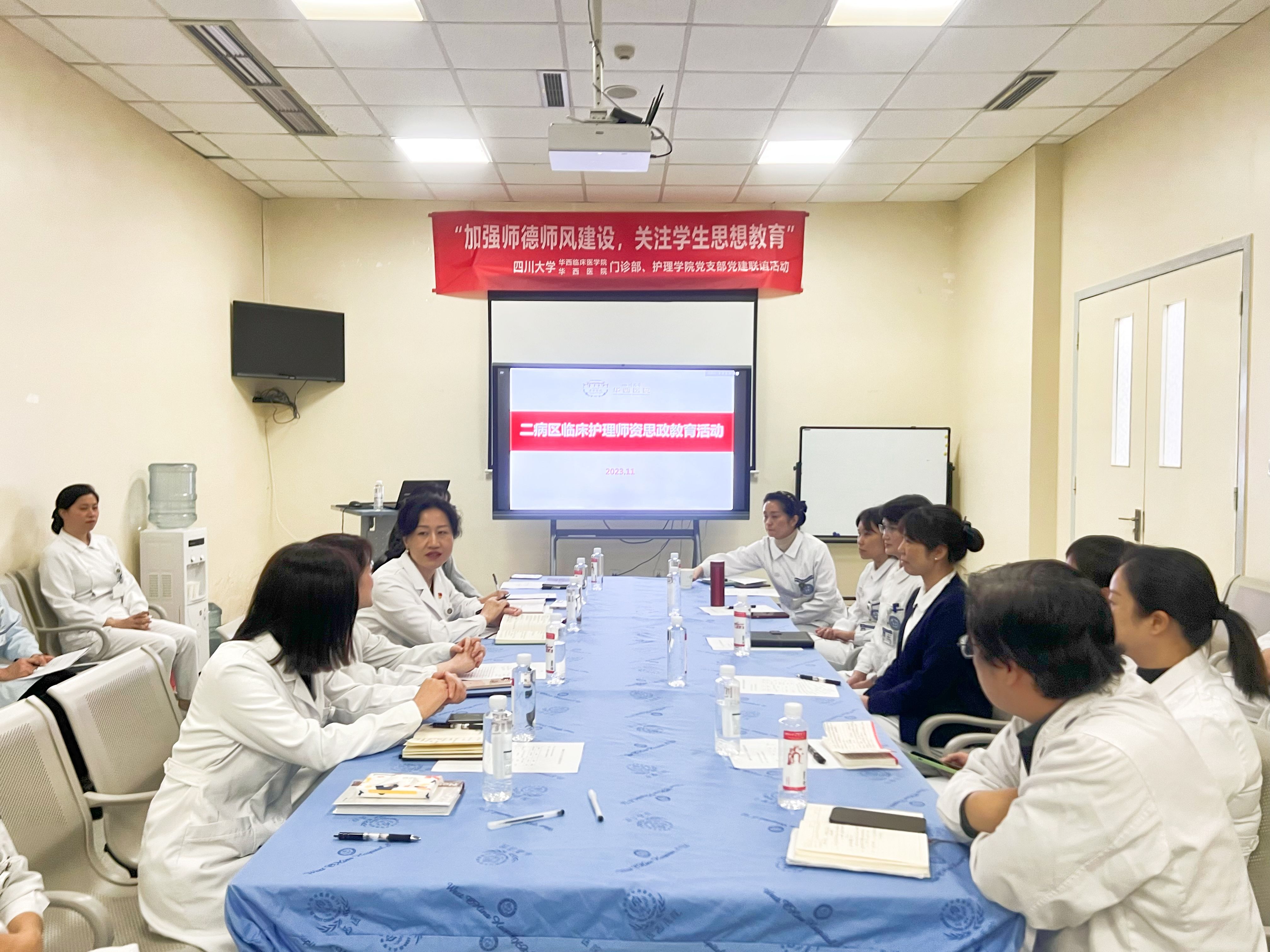 为深入贯彻习近平总书记关于思政教育的重要论述和全国宣传思想文化工作会议精神,进一步加强师德建设,关注学生思政教育。 11月8日下午,bat365中文官方网站华西医院门诊部党支部与护理学院党支部于入院服务中心健康教育室开展“加强师德建设,关注学生思政教育”主题党日活动。