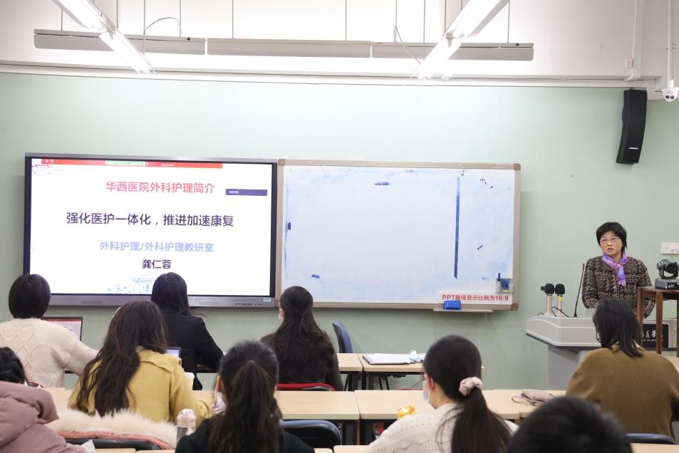 紧接着,陈佳丽老师带来了《医工结合学科交叉探索》,讲解了华西医工结合背景与流程,展示了骨科护理团队在医工结合临床探索与应用研究方面的经典案例;任秋平老师讲授了《外科关键技术:腹部术后伤口管理及引流管护理》,分享了我院伤口护理的标准化流程。随后,白阳静老师带来了《智慧护理建设》,从智慧门诊服务到智慧病房服务,以及护理信息化建设实践,凸显华西护理智慧化、智能化,用心为临床服务;郑娥老师以手术为课程导入,向大家讲述了《加速康复外科临床实践》,抛出“护士在加速康复的开展中扮演什么角色”等问题,促进两校同学积极交流探索。最后,丁嘉琳老师以《初级卫生保健与外科—华西肺结节/肺癌全程管理为例》,向香港理工大学的老师同学们呈现我院初级卫生保健相关工作内容。